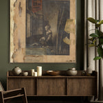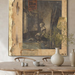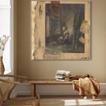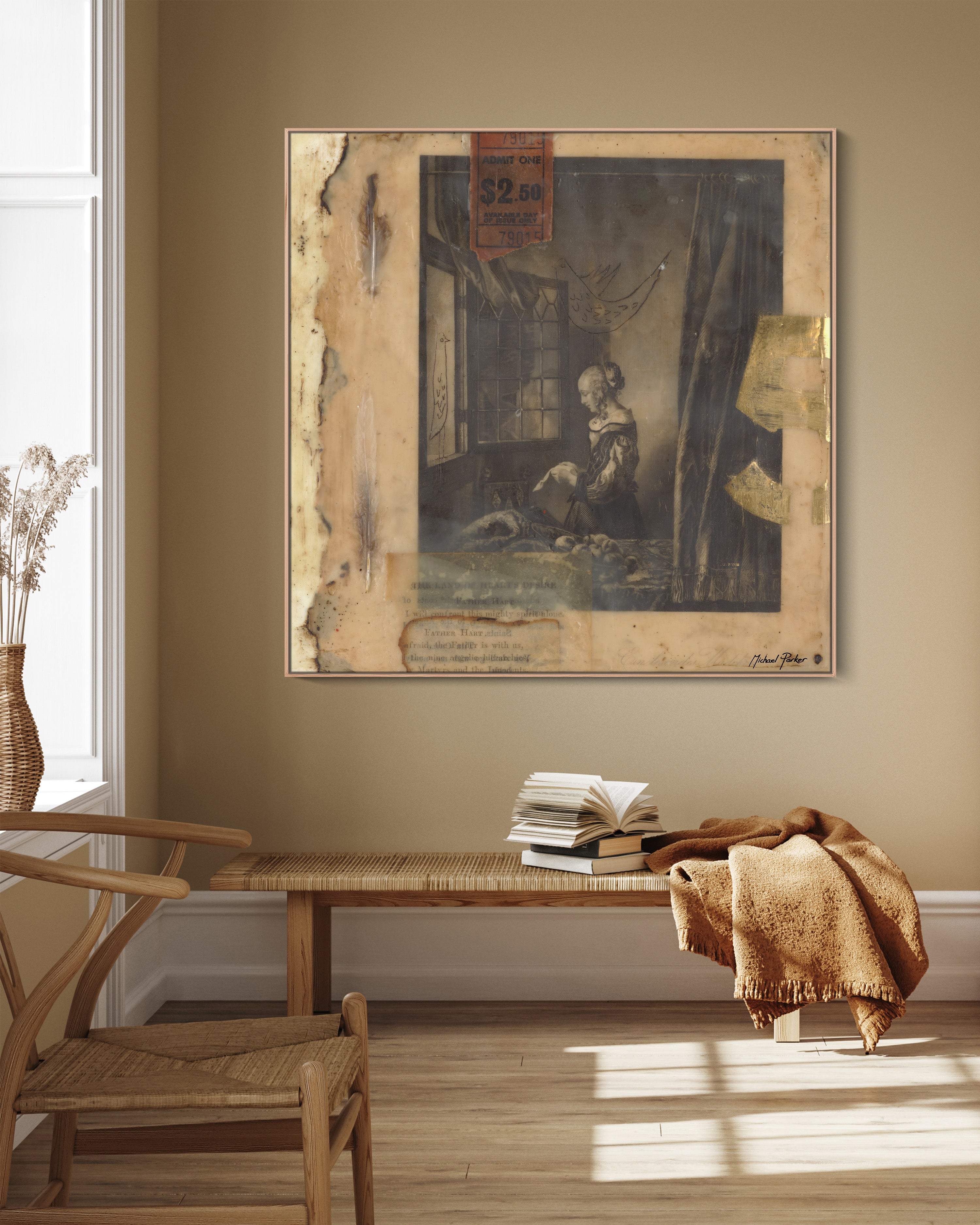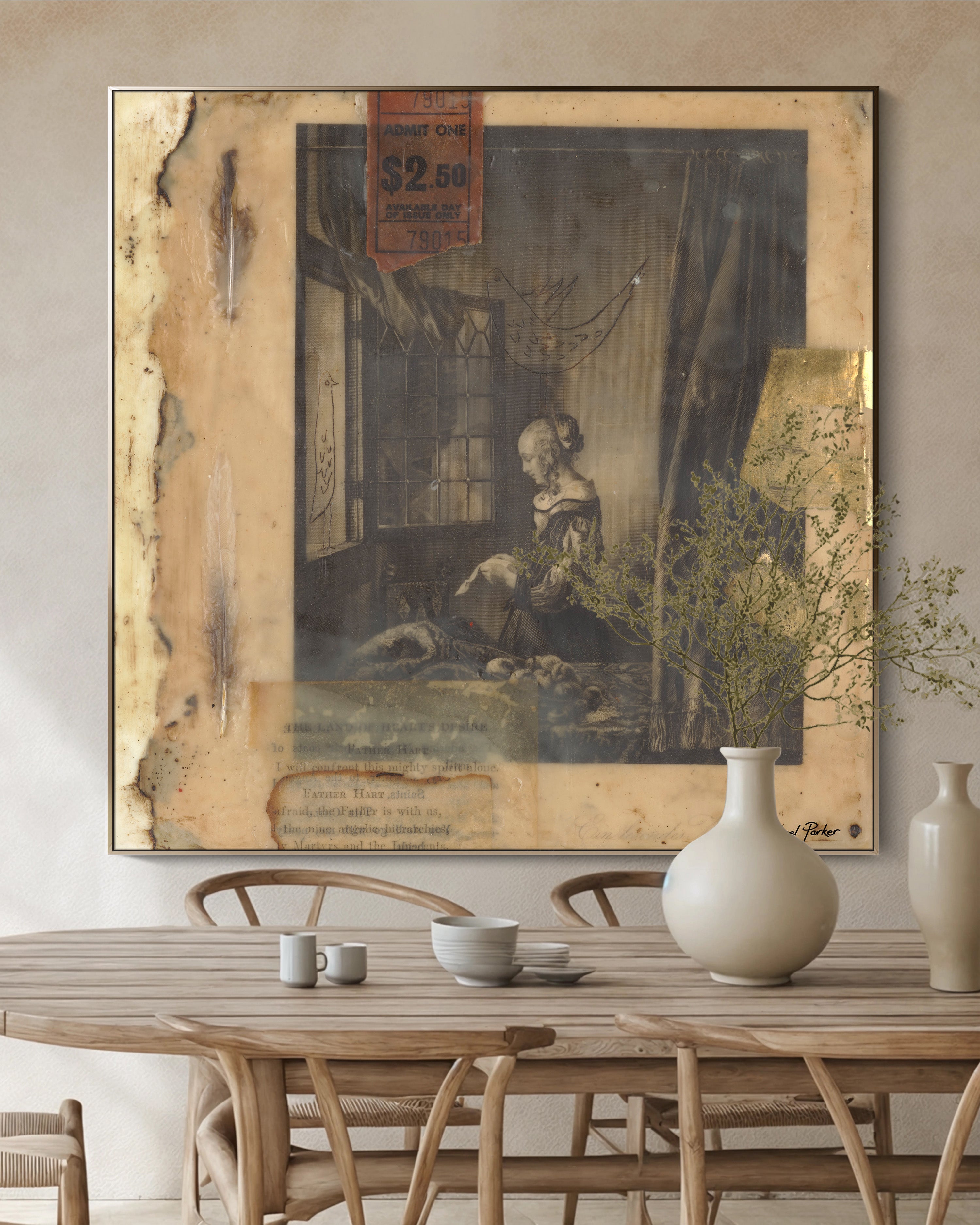 "Admit One to the Past ”Admit One to the Past” is a layered encaustic work that blends classical imagery with modern found elements. At the heart of the piece is a quiet moment, a woman reading by the window, lifted from a vintage print and surrounded by timeworn textures. Added to this are playful and nostalgic touches: a torn $2.50 ticket stub, a hand-drawn bird, the number 5, and fragments of faded text. This work explores how memory, history, and imagination overlap. It invites the viewer to reflect on what we hold onto, what we leave behind, and how stories continue to shift through time. It’s both a love letter to the past and a gentle reminder that even stillness is never truly still."