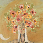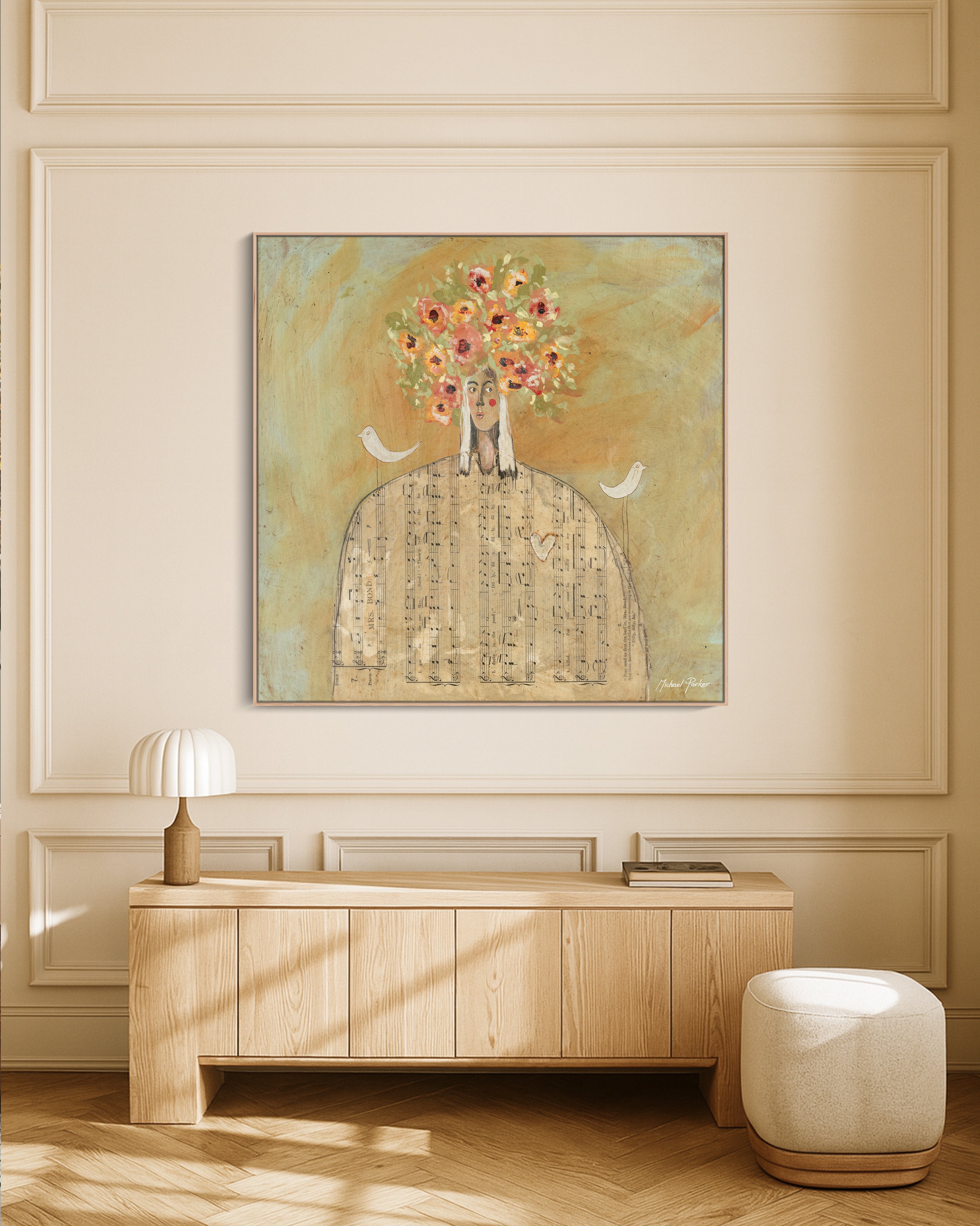 A Song for You is a quiet, lyrical offering, an ode to tenderness, memory, and the invisible threads that connect us. Built upon a bed of aged musical score, the figure stands grounded yet ethereal, their chest echoing with unspoken melodies. Flowers bloom from the crown of the head like thoughts in full colour, while white birds rest peacefully nearby, messengers of calm and connection. The encaustic wax softens each layer, wrapping the piece in a sense of nostalgia and warmth. This artwork is both a portrait and a poem, an invitation to pause, listen inward, and feel the music within.