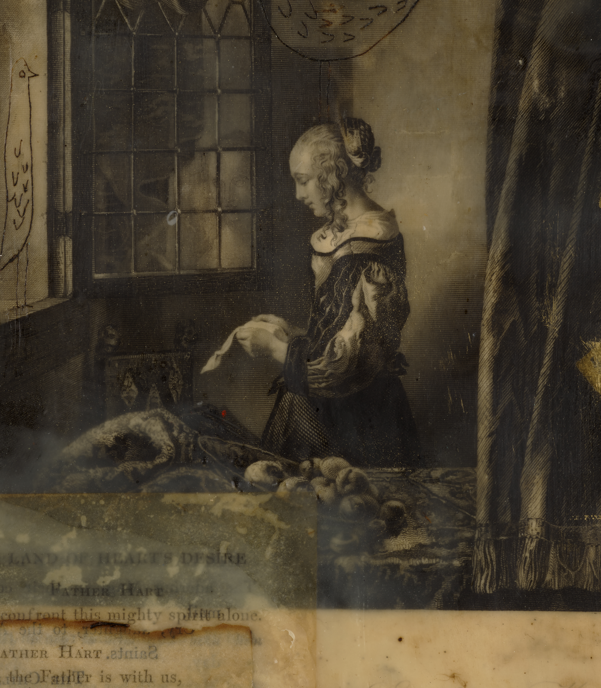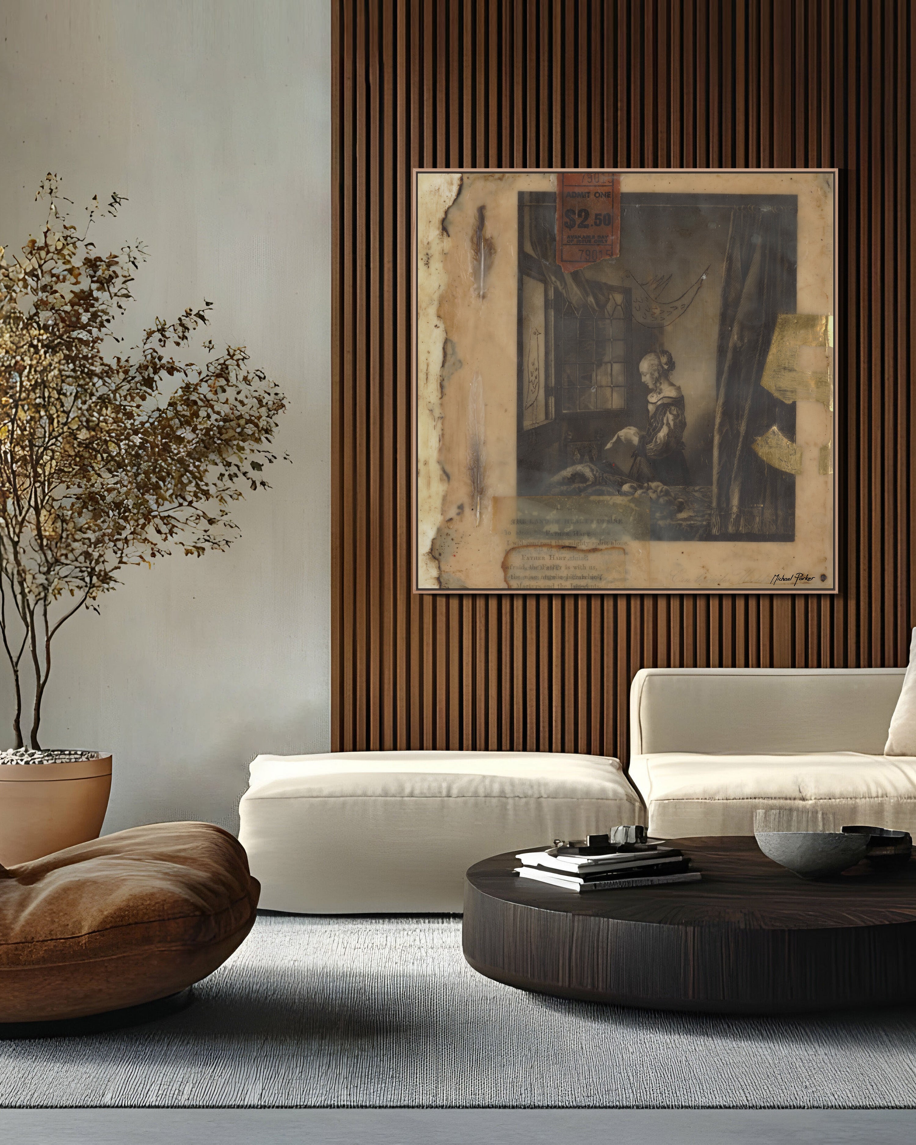 "Admit One to the Past ”Admit One to the Past” is a layered encaustic work that blends classical imagery with modern found elements. At the heart of the piece is a quiet moment, a woman reading by the window, lifted from a vintage print and surrounded by timeworn textures. Added to this are playful and nostalgic touches: a torn $2.50 ticket stub, a hand-drawn bird, the number 5, and fragments of faded text. This work explores how memory, history, and imagination overlap. It invites the viewer to reflect on what we hold onto, what we leave behind, and how stories continue to shift through time. It’s both a love letter to the past and a gentle reminder that even stillness is never truly still."