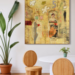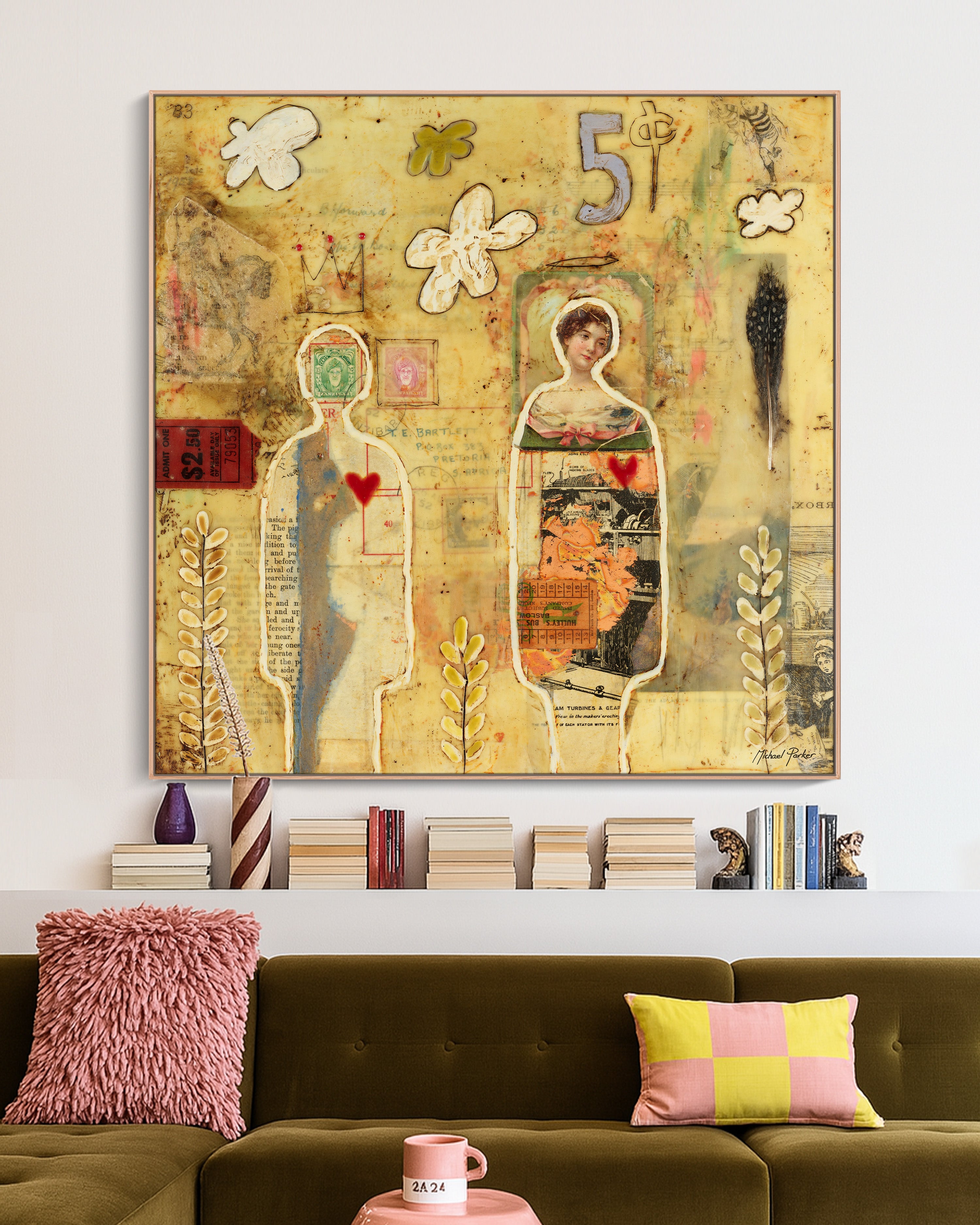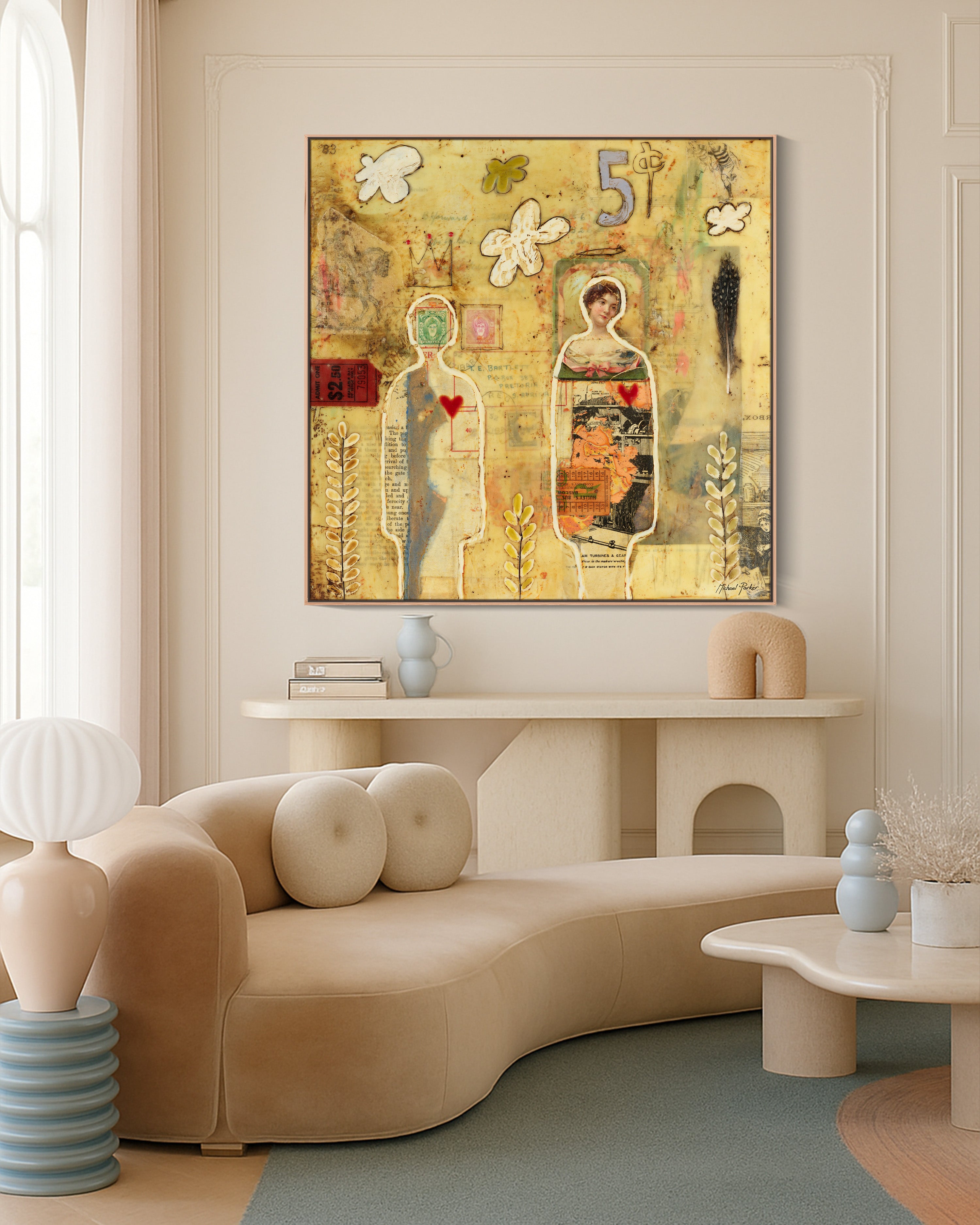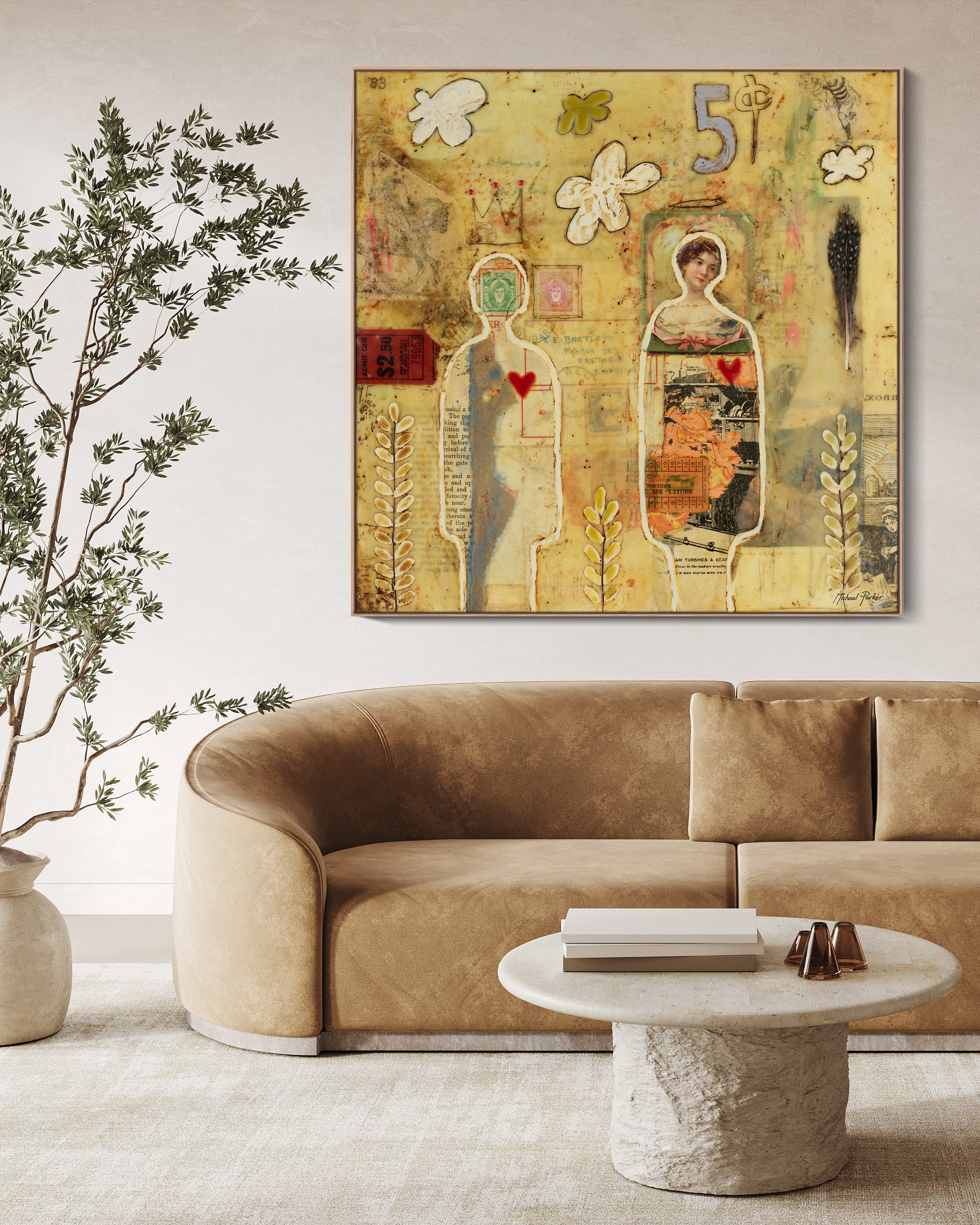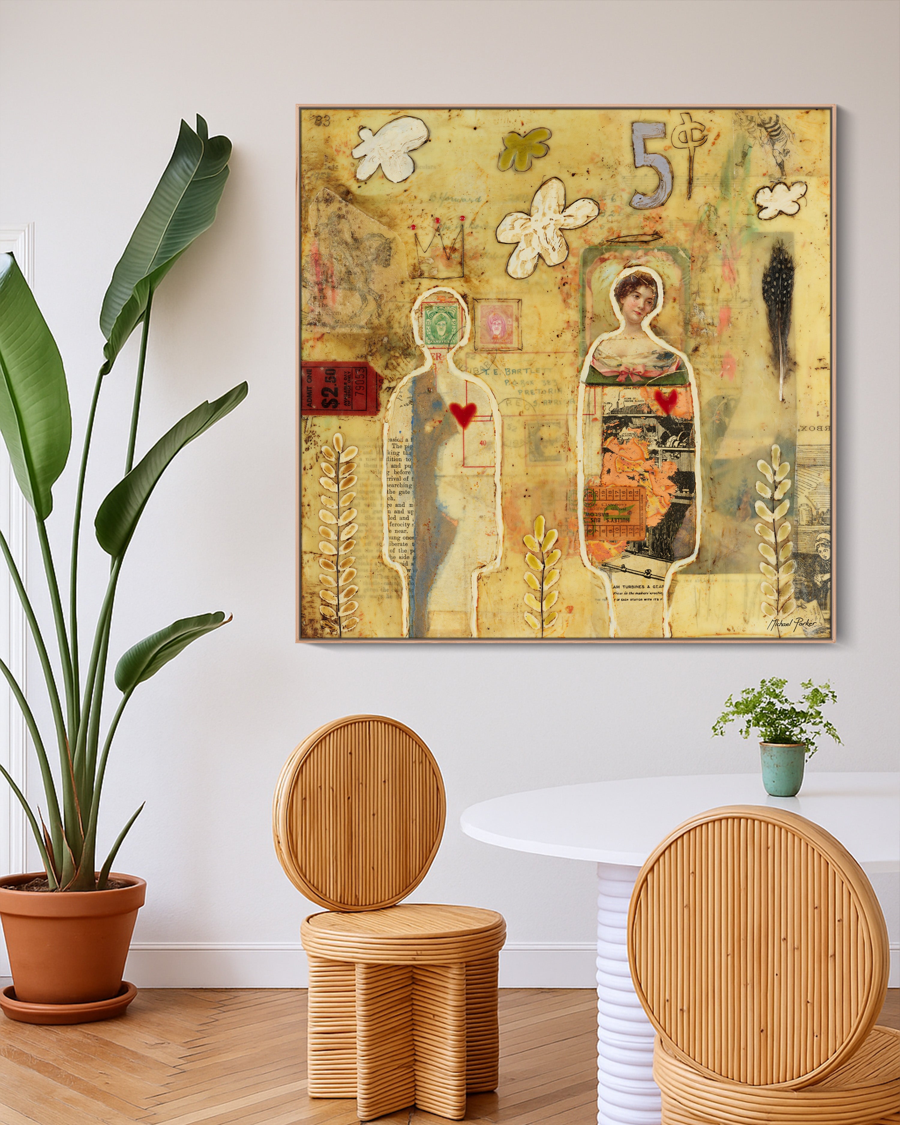 "In Love You in the Face, two figures stand side by side, delicately outlined in white, their hearts boldly marked in red. Created originally in encaustic wax, this piece layers aged ephemera, postage stamps, handwritten notes, feathers and antique advertisements into a dreamlike portrait of connection. The figures feel both universal and deeply personal, like silhouettes of memory brought gently to the surface. There’s a quiet tenderness in the way they face forward, not toward each other, yet undeniably linked. This fine art print captures the texture and detail of the original mixed media piece, preserving its layered character and emotional depth."