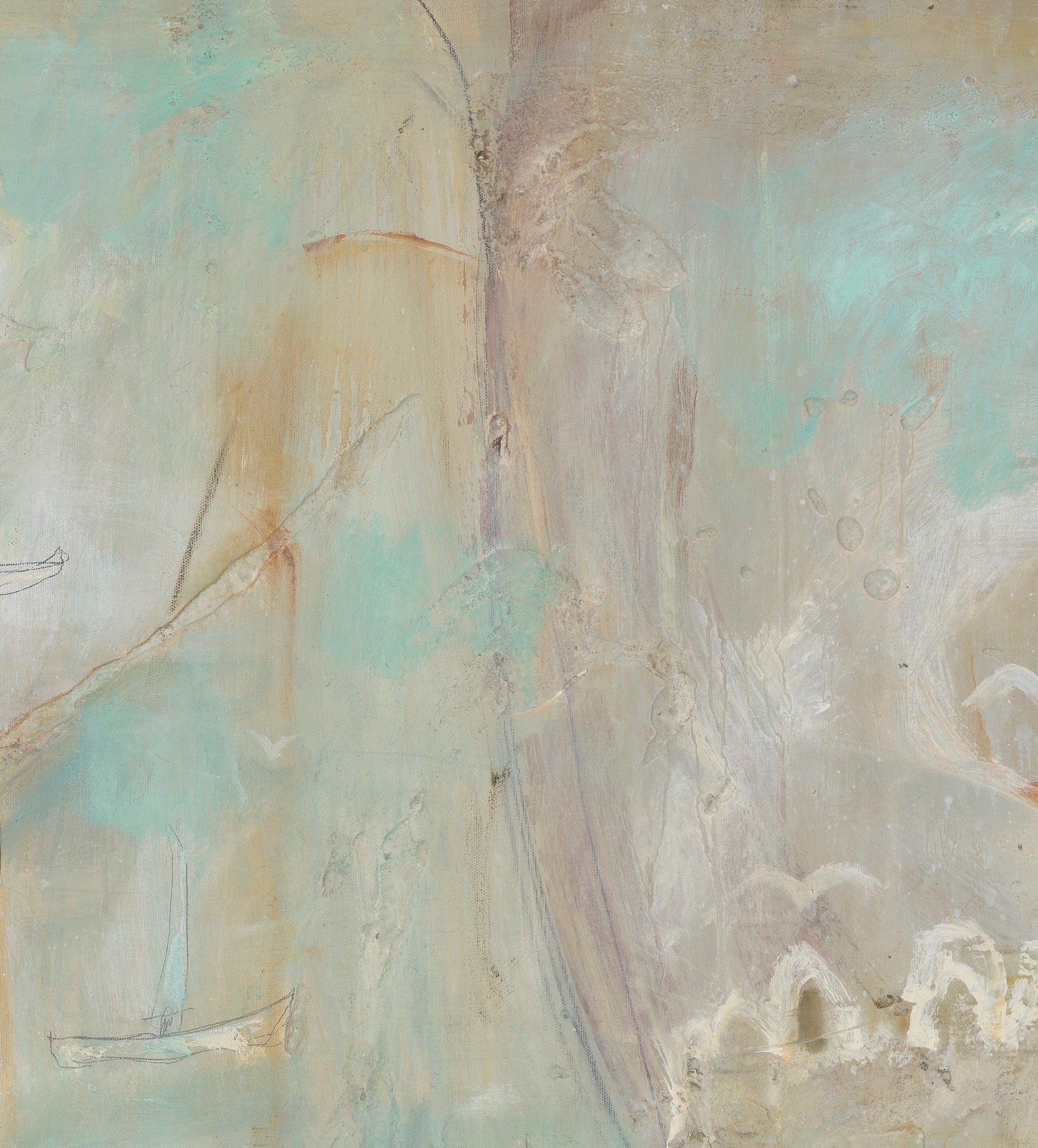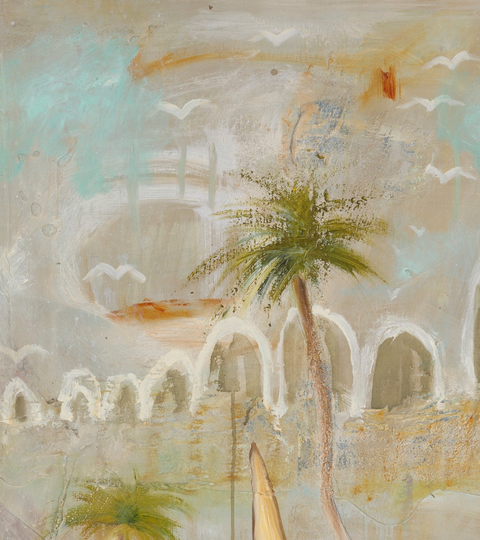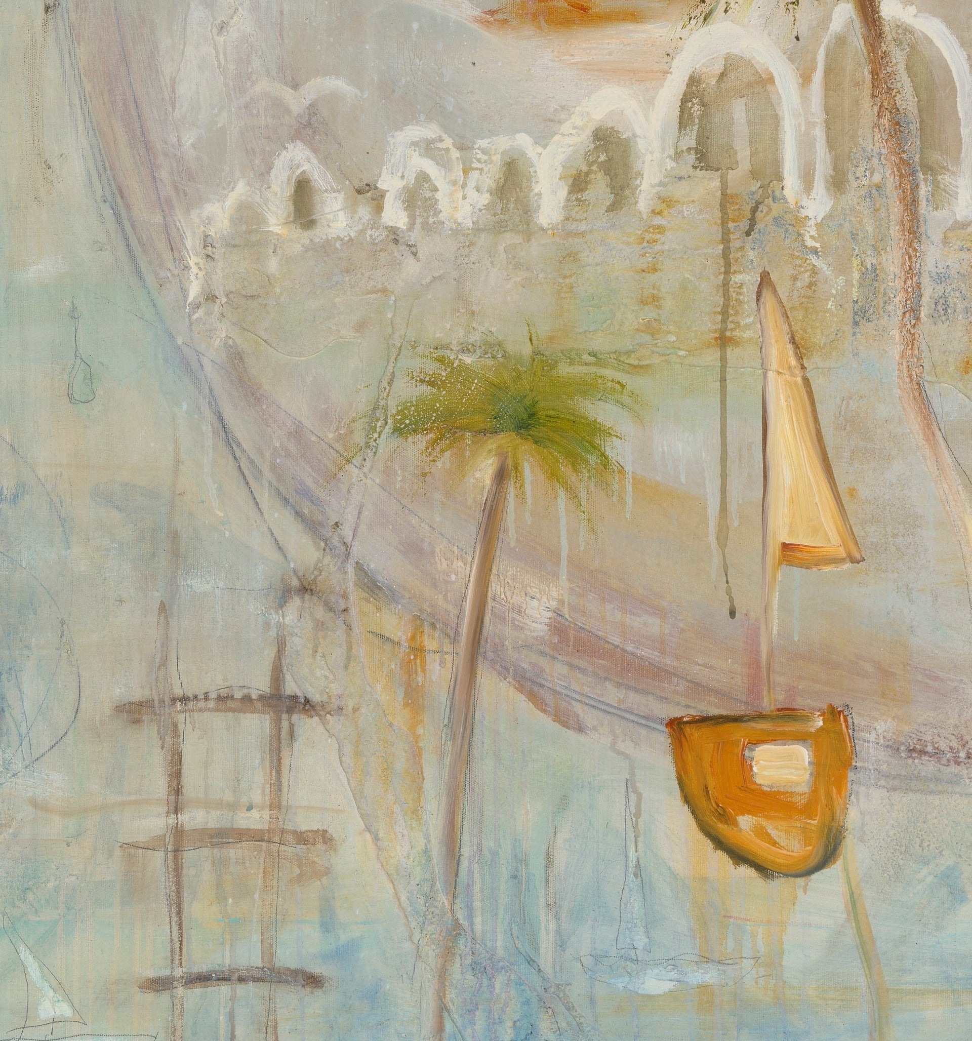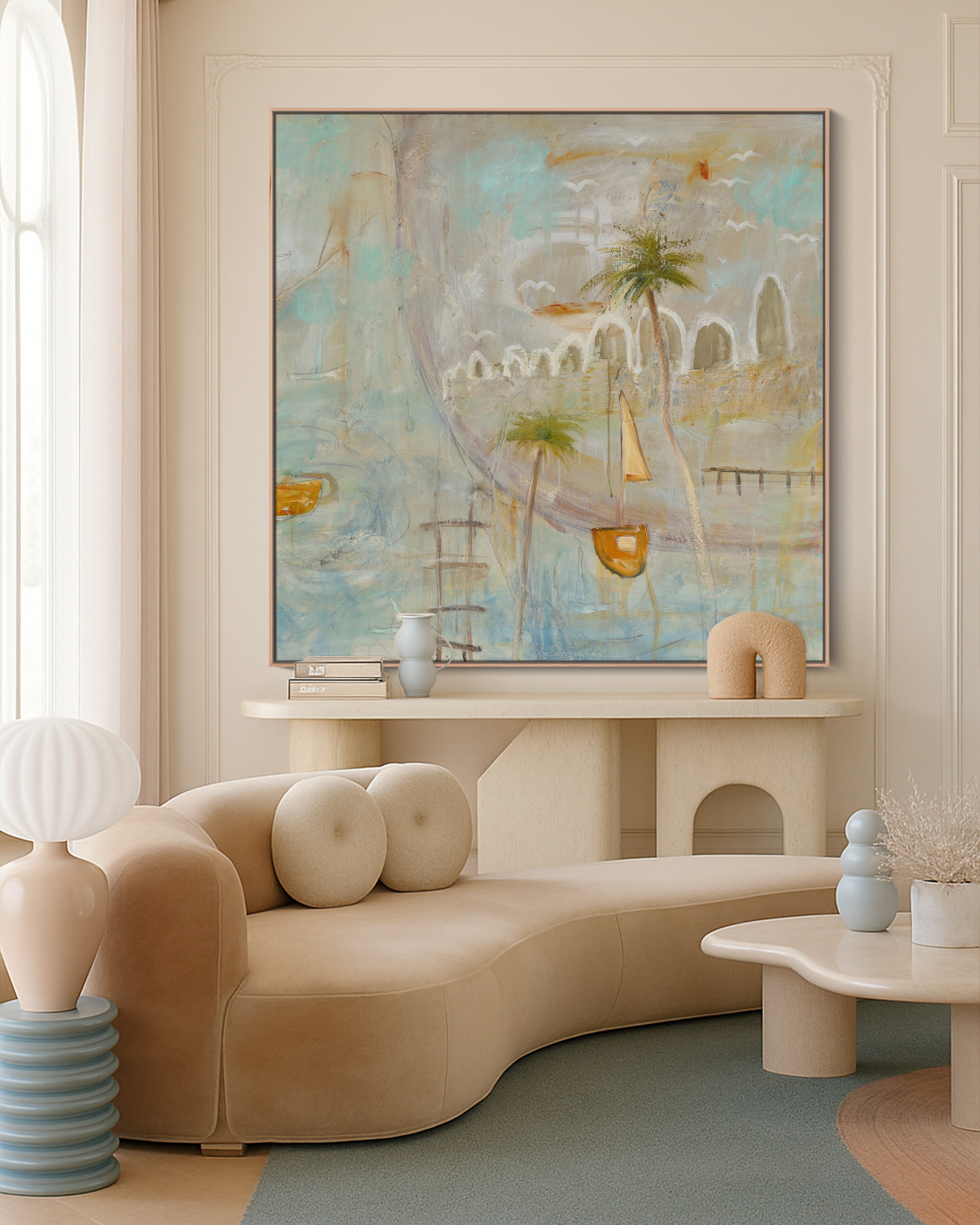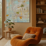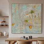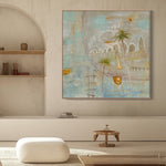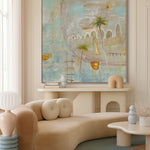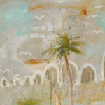 Boat Bay drifts between memory and dream, evoking a quiet seaside village where time moves slowly and the breeze carries stories of old. Soft washes of aqua, ochre, and cloud-white create a luminous atmosphere, suggesting salt in the air and sunlight reflecting on water. Boats rest gently in the harbour, their stillness hinting at recent journeys or ones yet to come. Palm trees lean into the composition like gentle guardians, grounding the scene in warmth and familiarity. Boat Bay is less about geography and more about feeling — a serene return to a place within, where the heart floats freely.