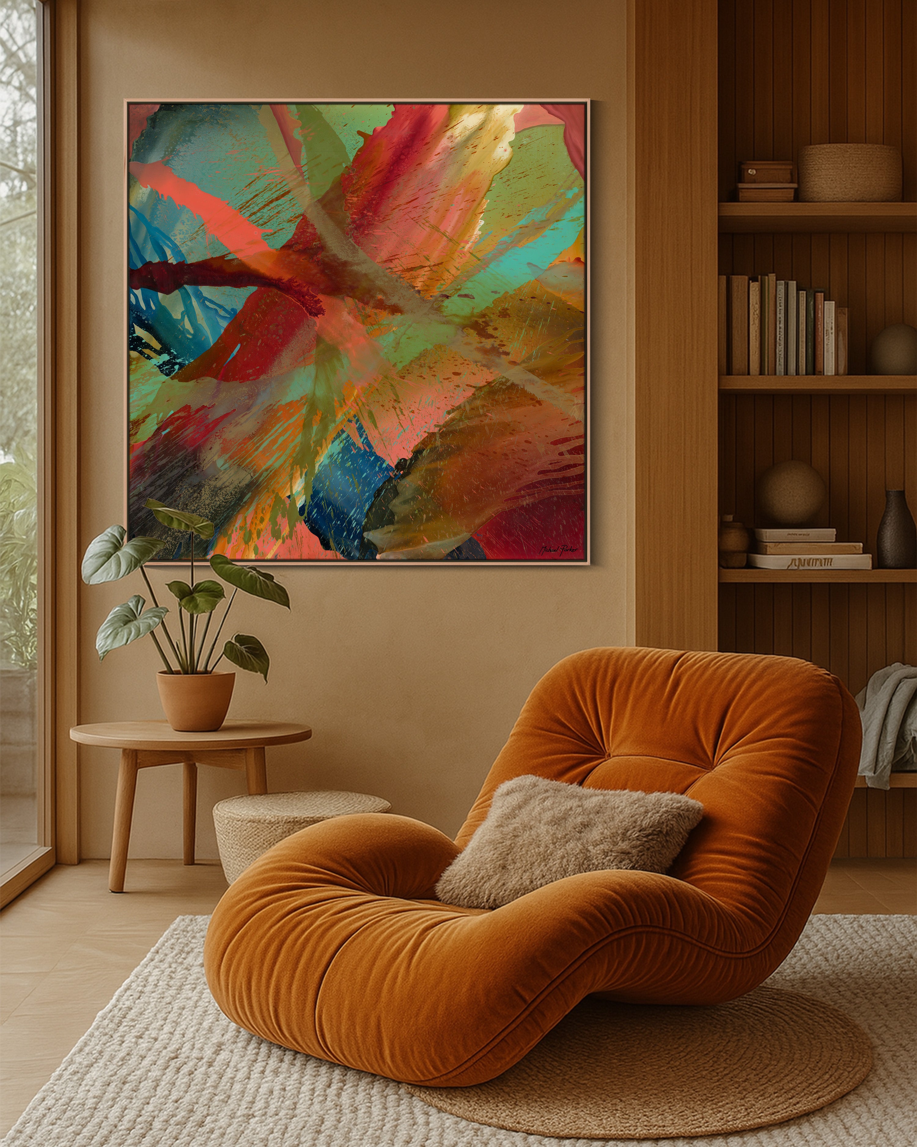 A Joy Too Bright To Hold is an explosion of colour and motion, capturing a fleeting emotional intensity, the kind of joy that arrives without warning and fills every corner of the body. With sweeping gestures and vivid contrasts, the work channels raw energy, movement, and a sense of emotional release. It speaks to those moments that feel too expansive to contain, when life’s brightness pushes past the edges. This piece invites the viewer to surrender to sensation, to colour, to the beauty of what cannot be held still.