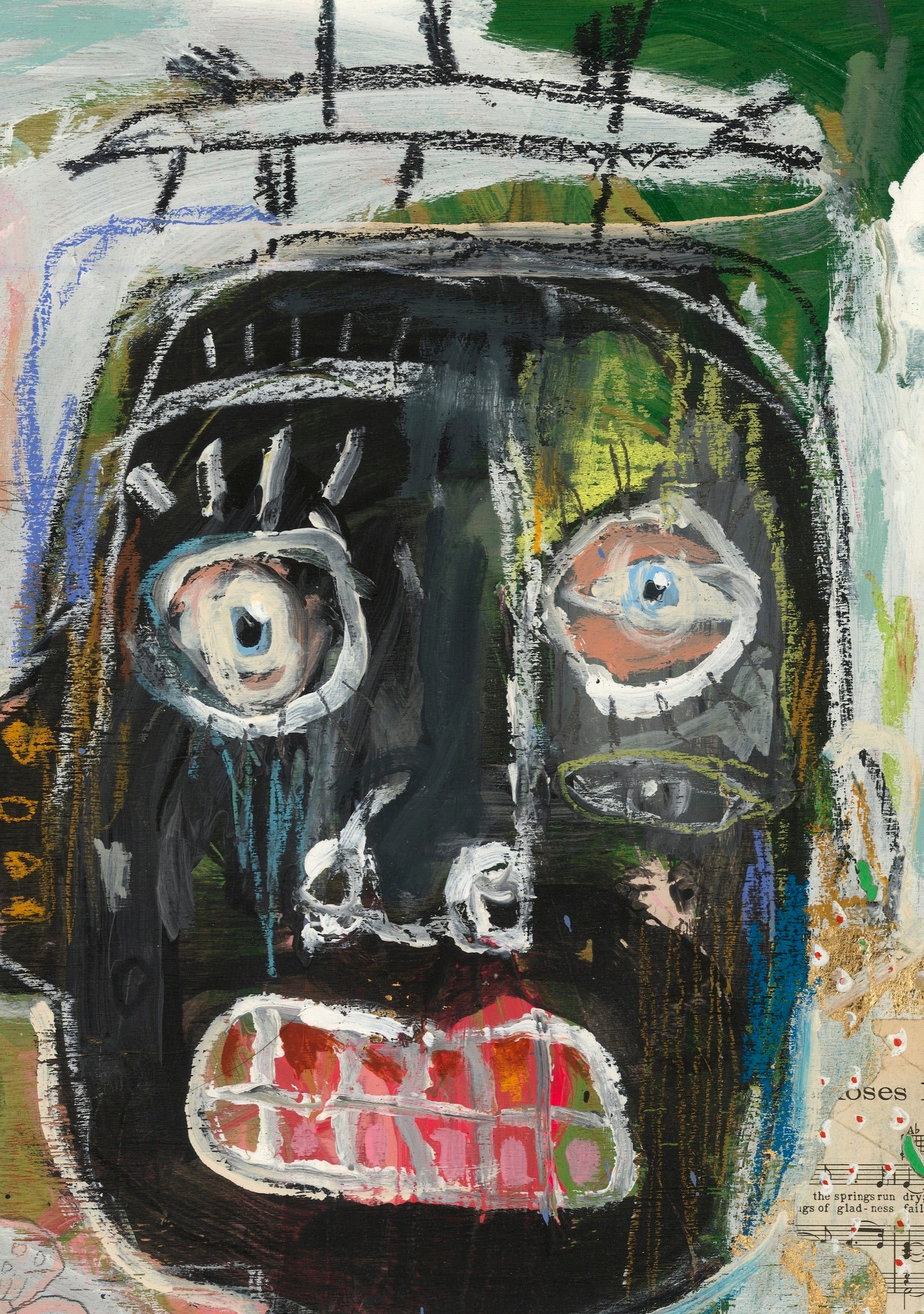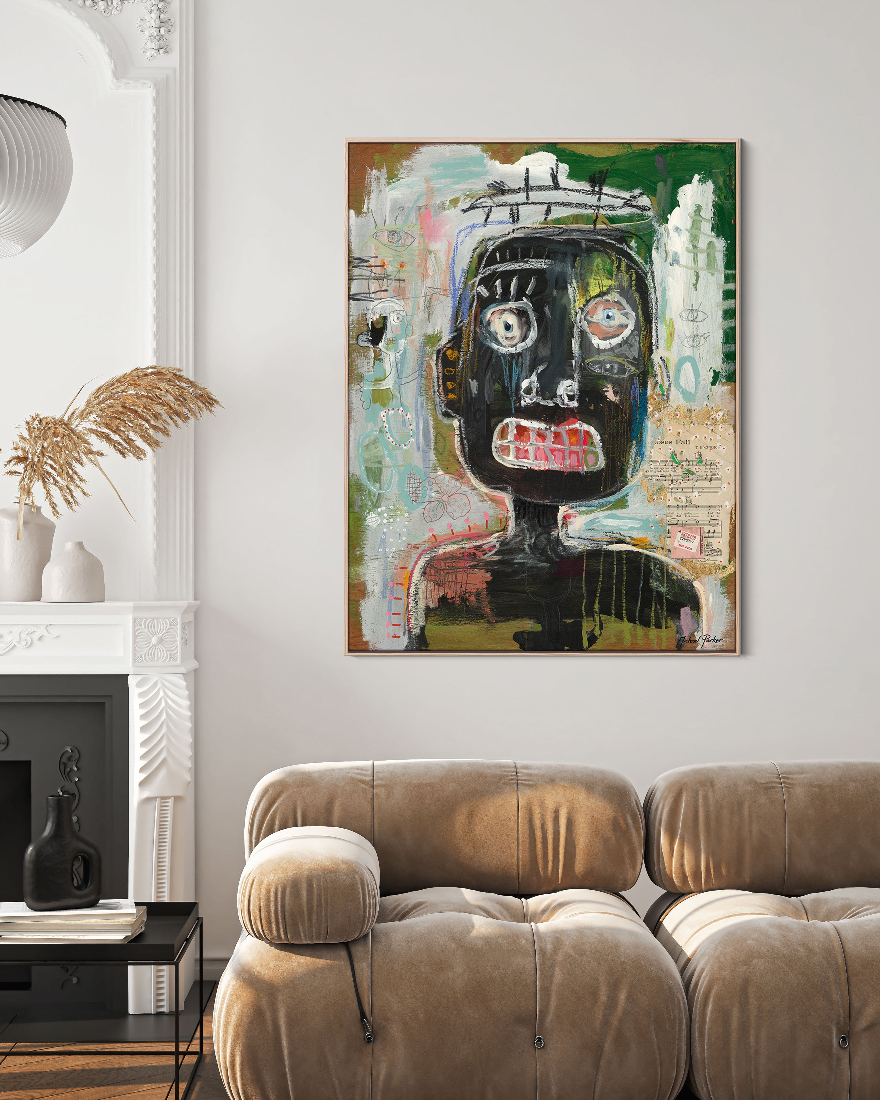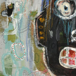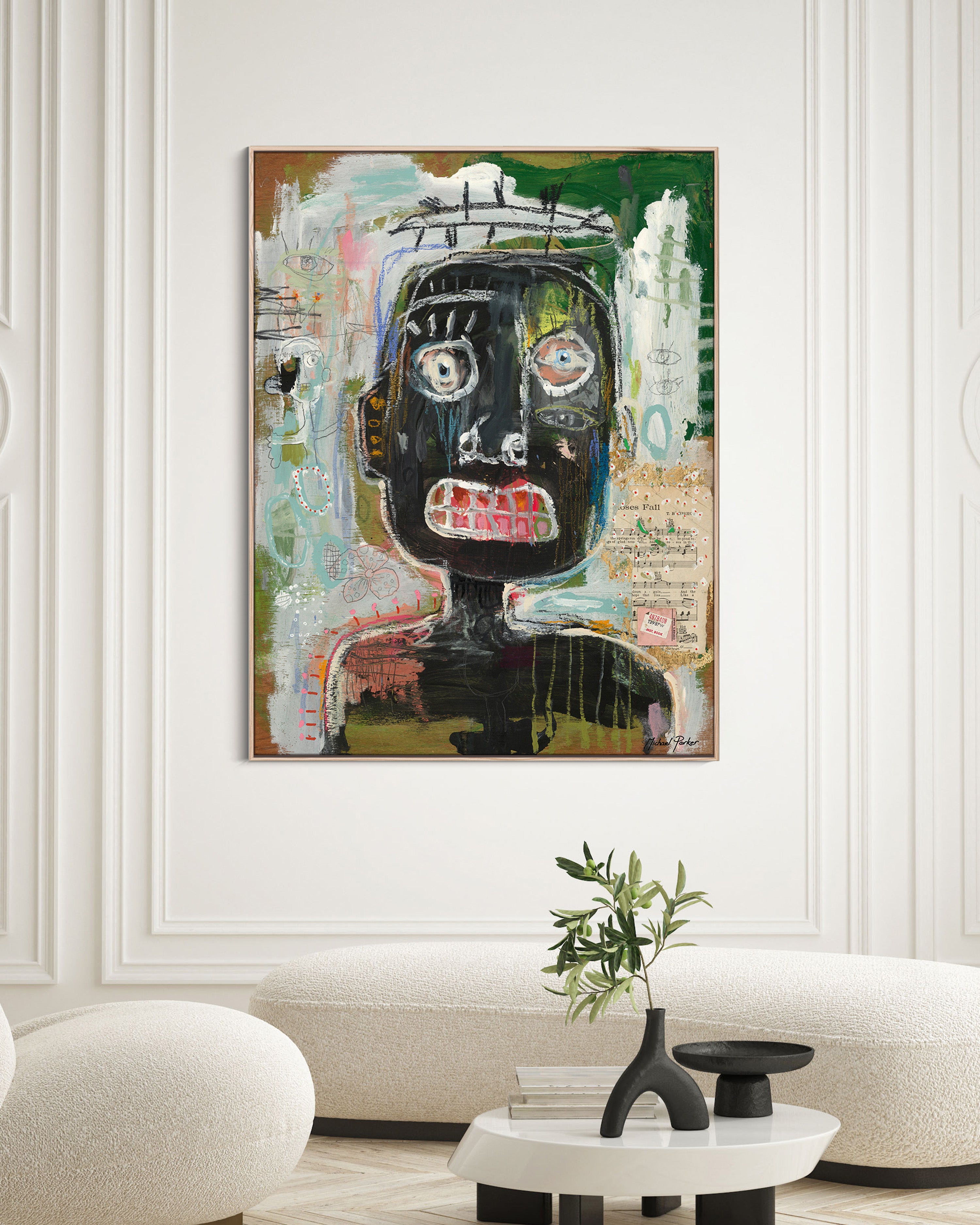 The Chorus in My Head is a portrait of internal noise, a tangle of thoughts, memories, and emotions that rise and fall like a song you can’t turn off. The figure’s raw expression, wide eyes, and bared teeth reflect a mind alive with energy, confusion, and reflection. Collaged elements like vintage sheet music and ticket stubs add rhythm and story, while repeated marks and symbols echo like refrains. This fine art print captures the texture and detail of the original mixed media piece, preserving its layered character and emotional depth, a visual soundtrack of feeling, scribbled in paint, paper, and persistence.