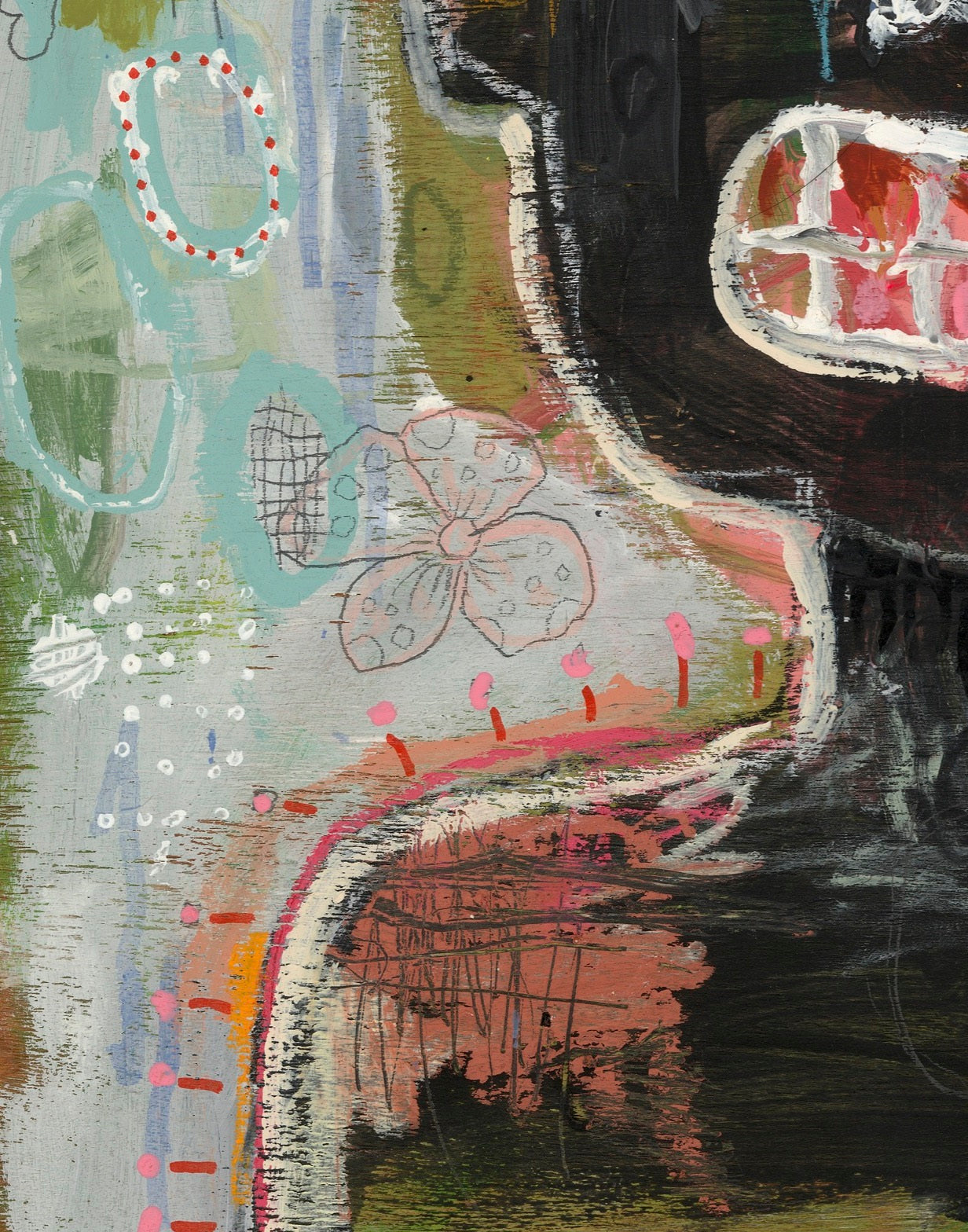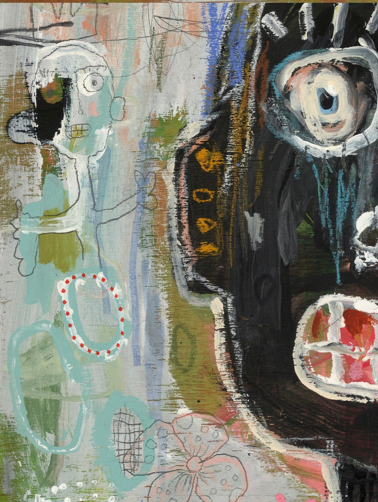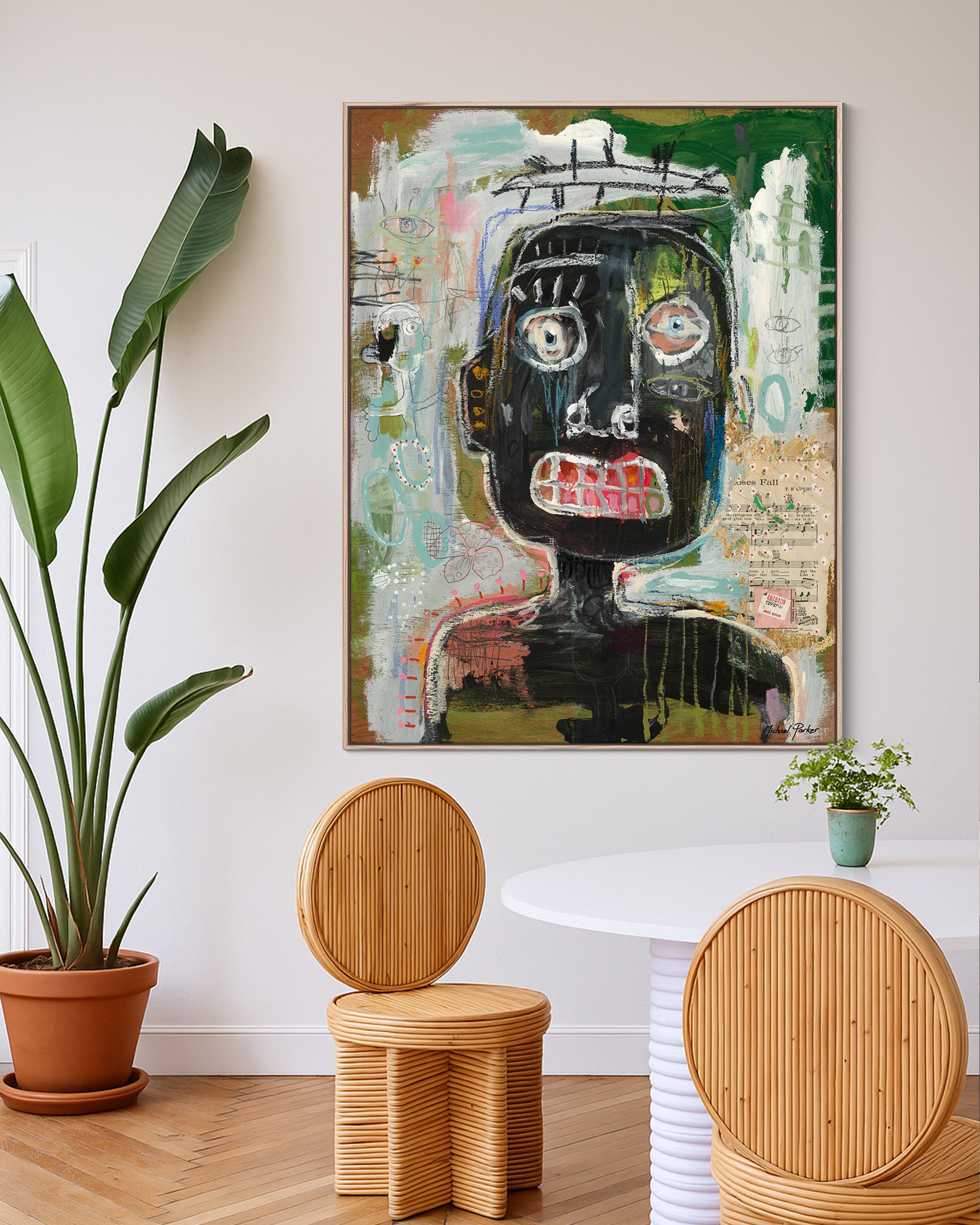 The Chorus in My Head is a portrait of internal noise, a tangle of thoughts, memories, and emotions that rise and fall like a song you can’t turn off. The figure’s raw expression, wide eyes, and bared teeth reflect a mind alive with energy, confusion, and reflection. Collaged elements like vintage sheet music and ticket stubs add rhythm and story, while repeated marks and symbols echo like refrains. This fine art print captures the texture and detail of the original mixed media piece, preserving its layered character and emotional depth, a visual soundtrack of feeling, scribbled in paint, paper, and persistence.