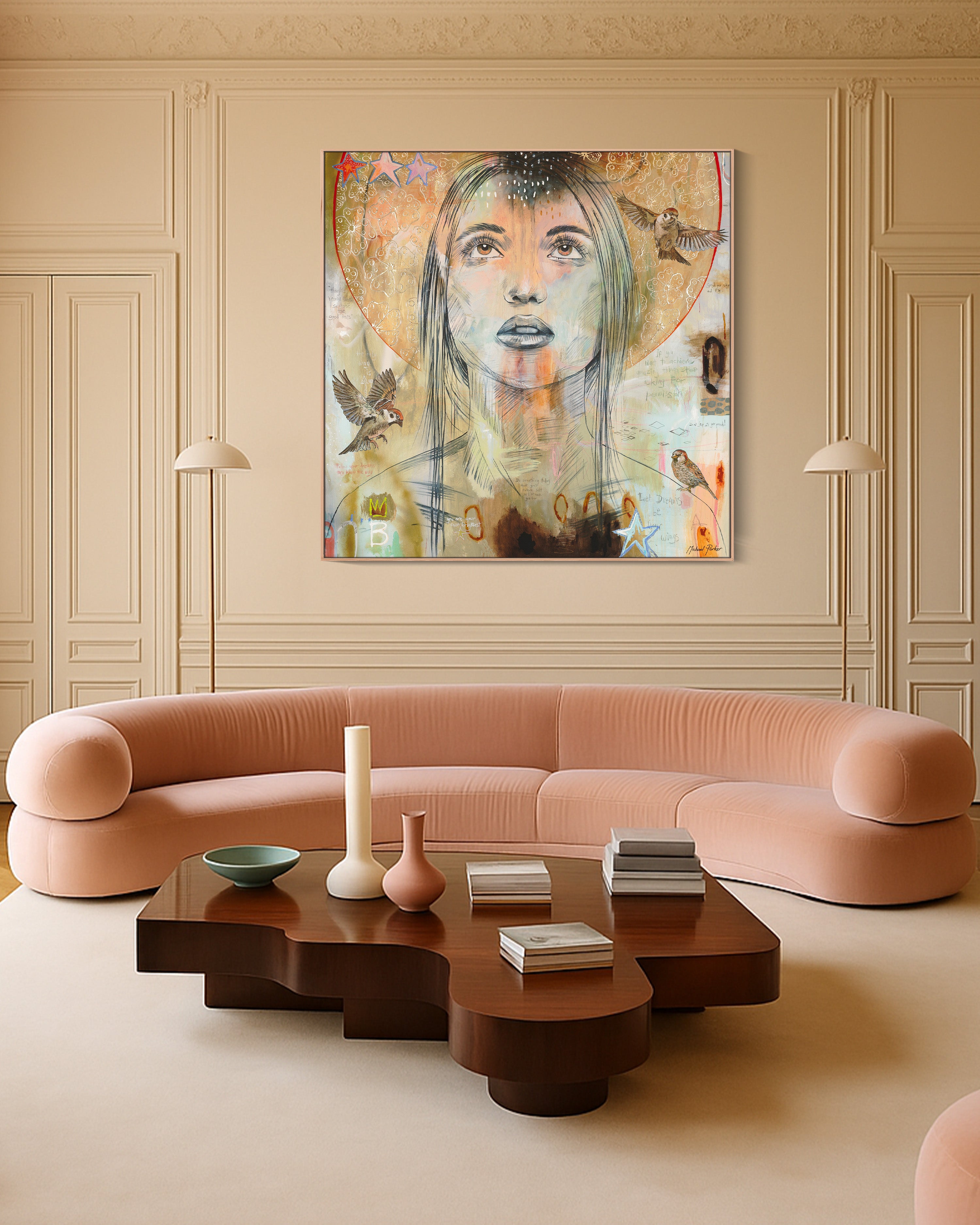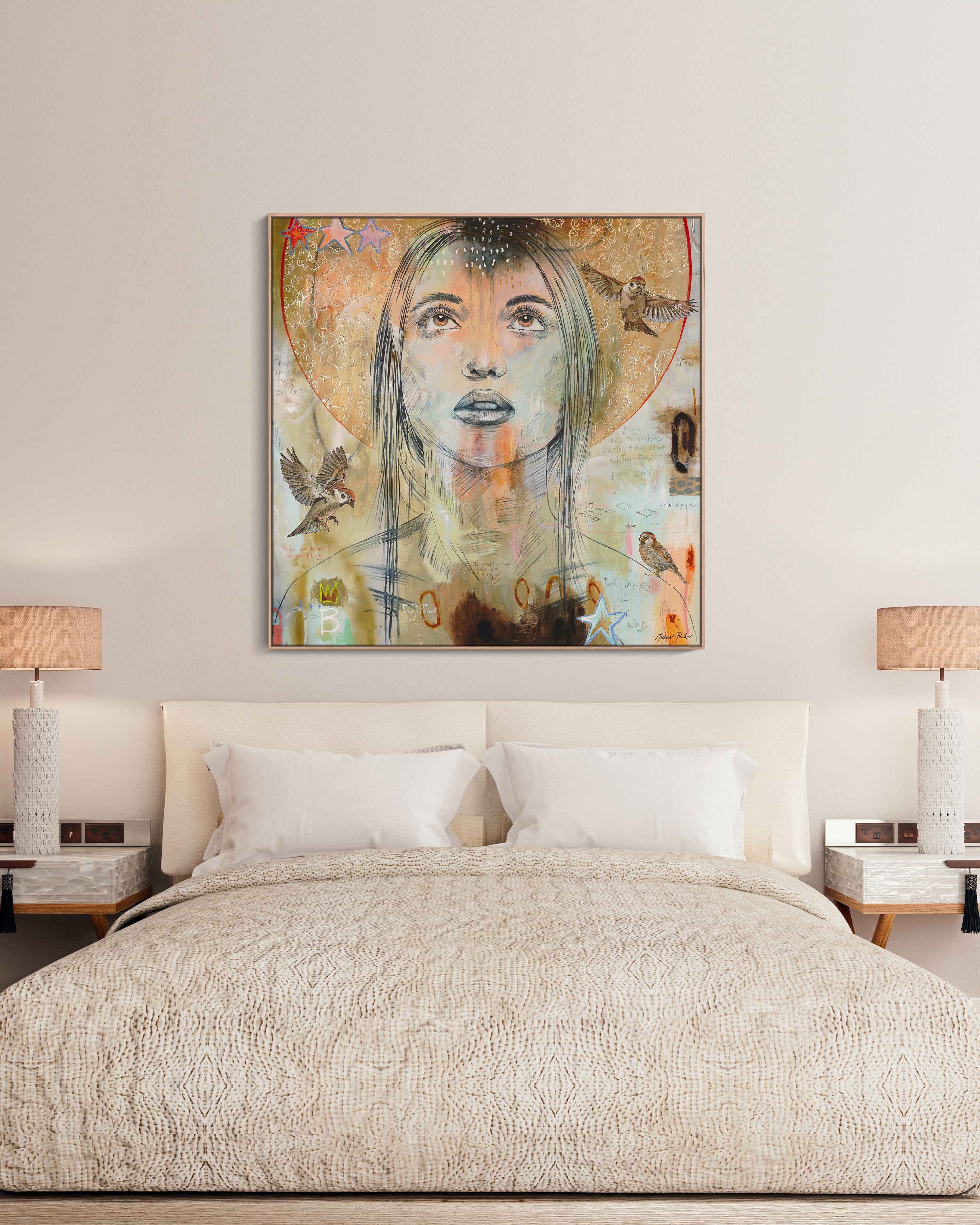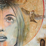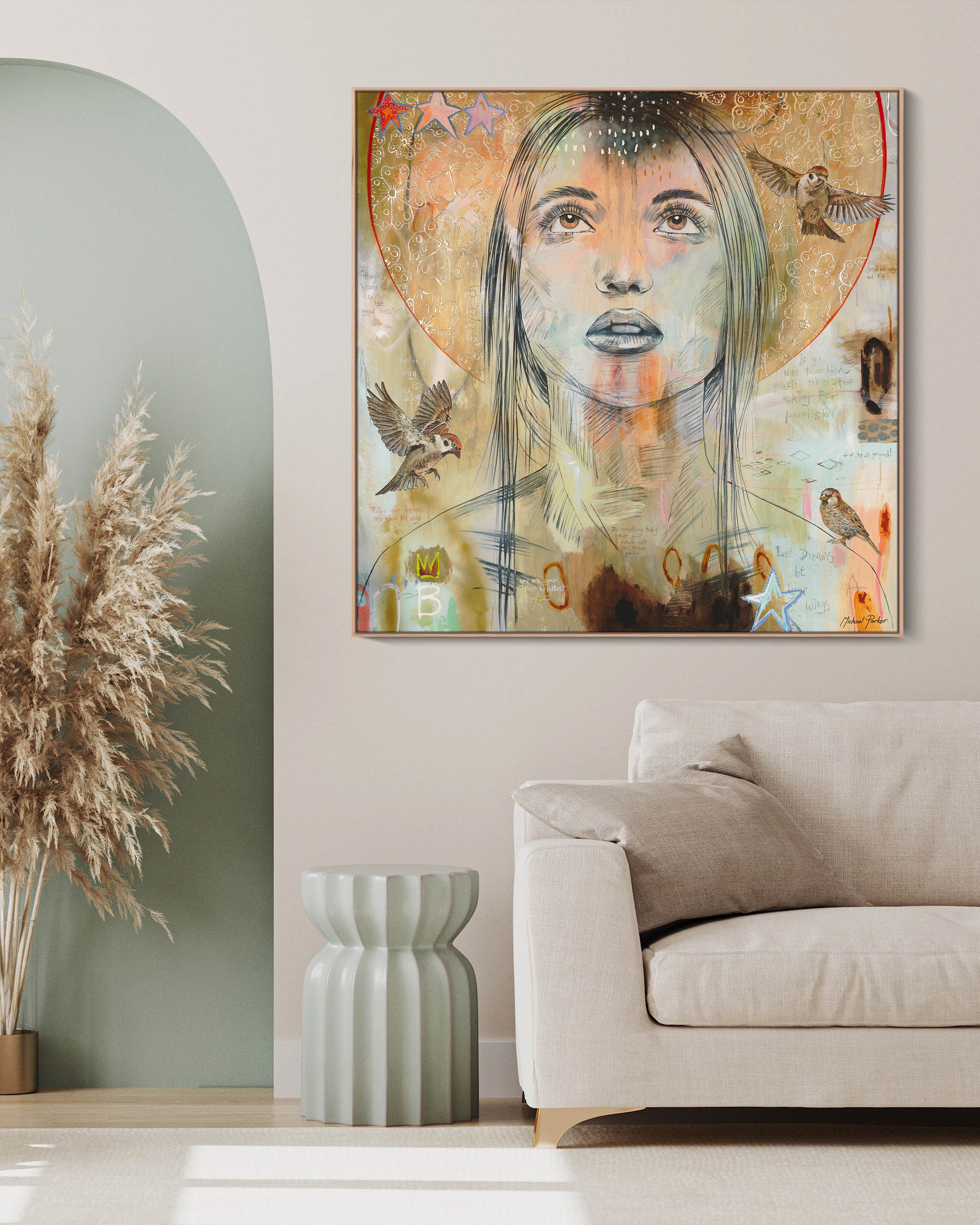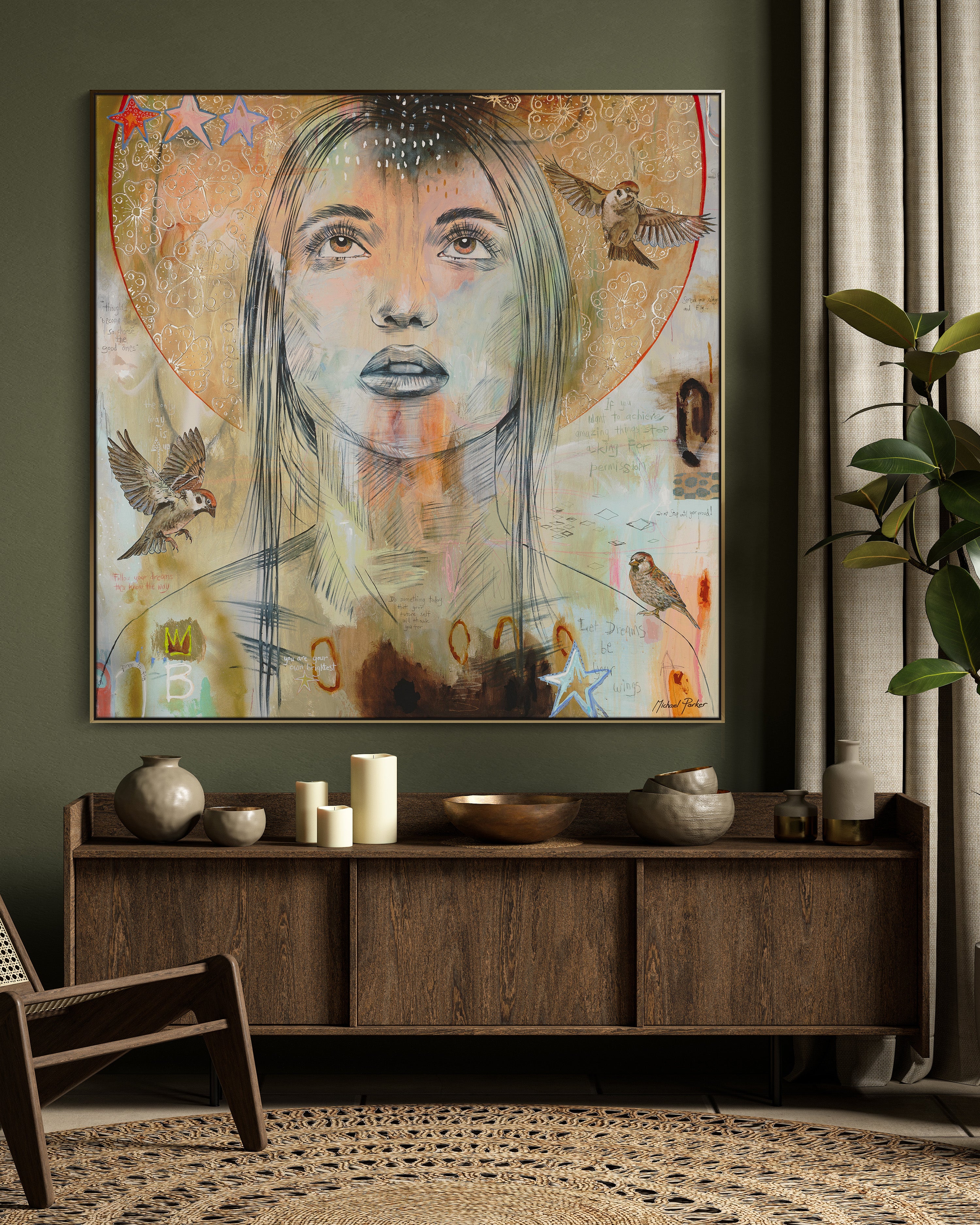 With Brave Wings She Flies is a celebration of inner courage and quiet awakening. The central figure gazes upward, illuminated by a symbolic golden halo that reflects her expanding consciousness and hope. Surrounding her, sparrows rise and circle, messengers of resilience, freedom, and gentle strength. Layers of marks, patterns, and handwritten affirmations weave through the composition, echoing the complexity of personal growth. Soft warm tones blend with cool hues to create a dreamlike, uplifting atmosphere. This piece invites viewers to look inward, trust their own path, and embrace the brave wings they already carry within.