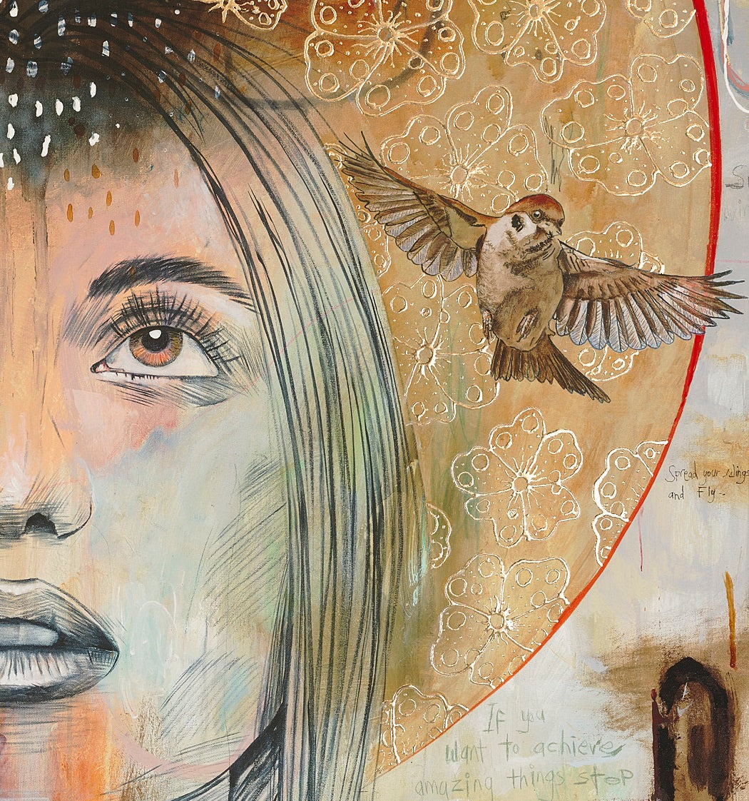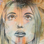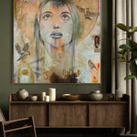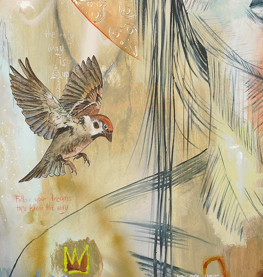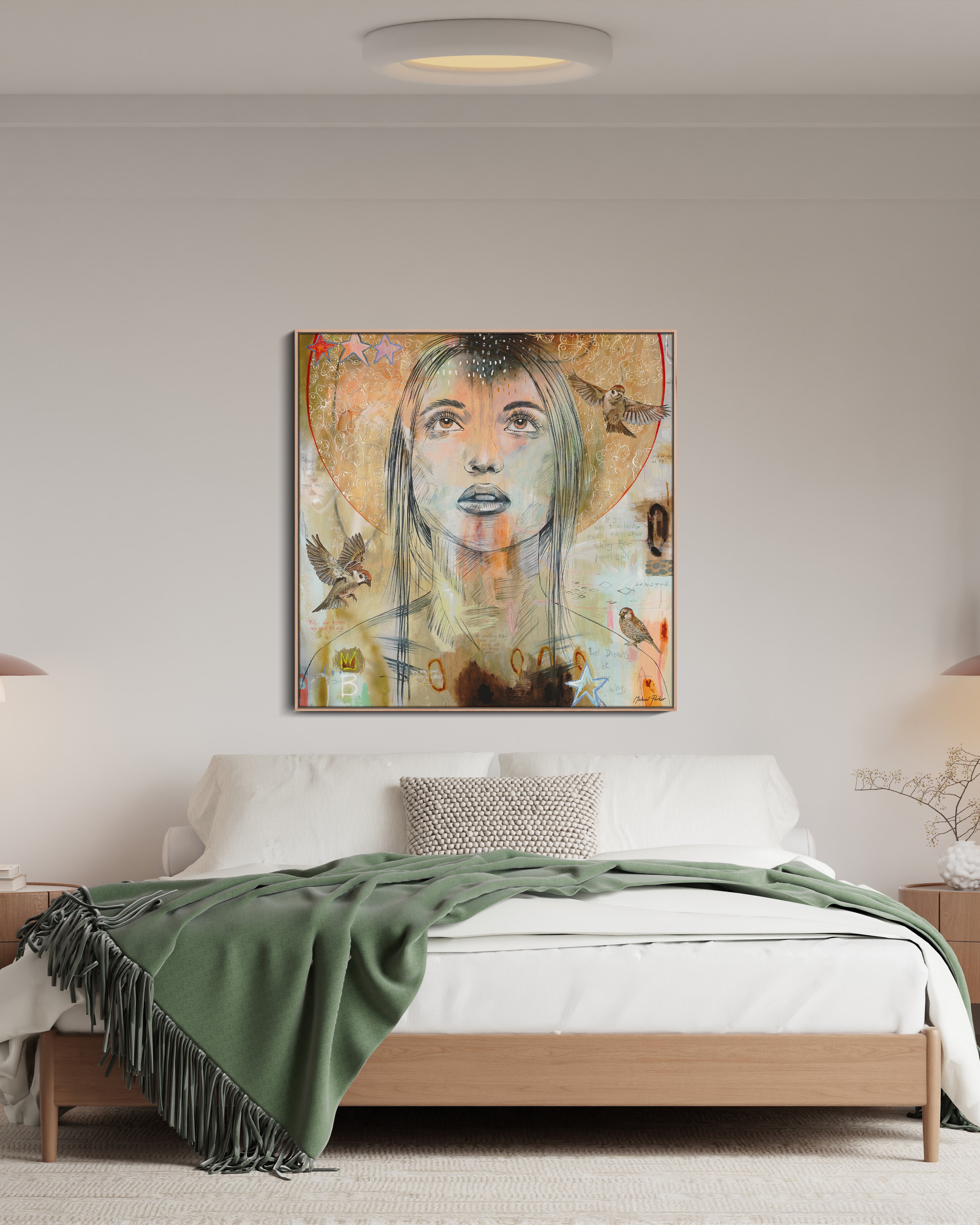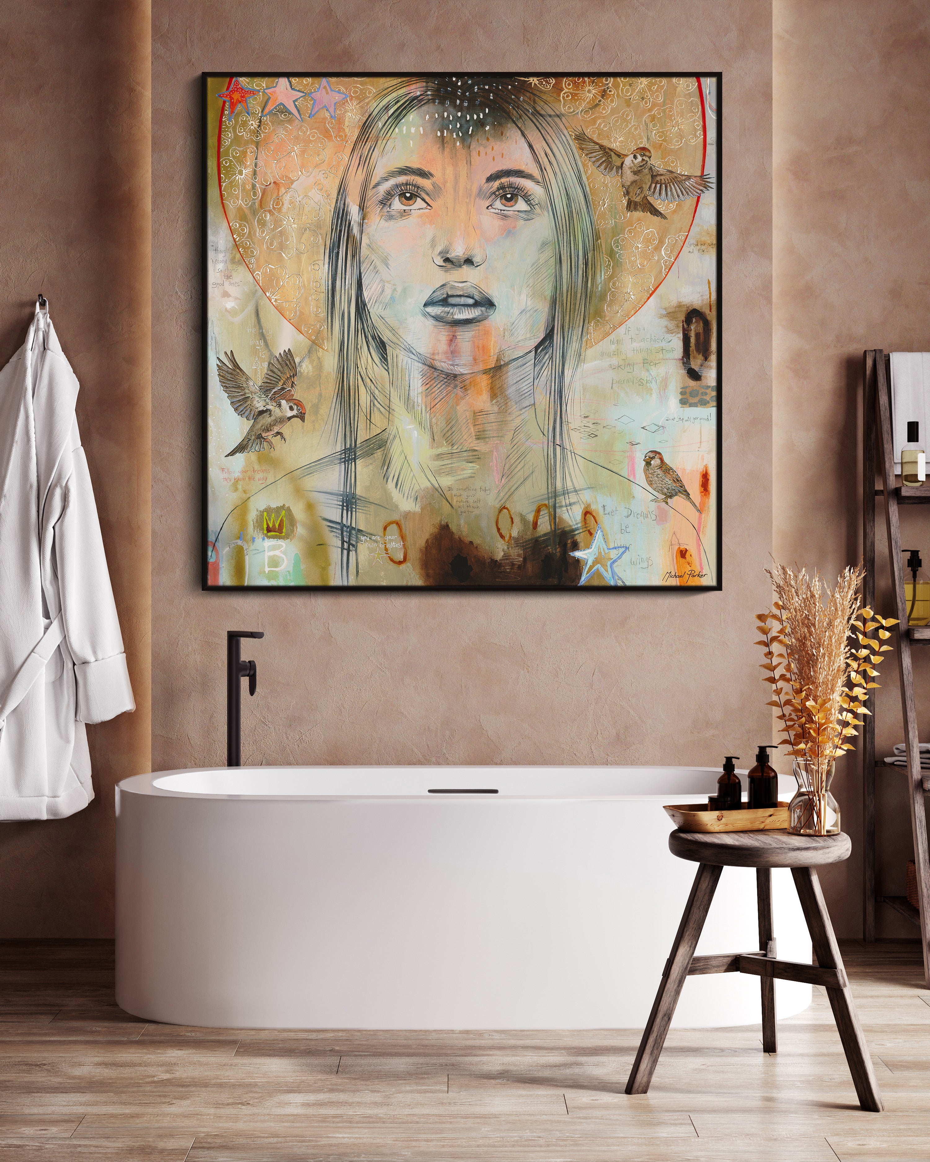 With Brave Wings She Flies is a celebration of inner courage and quiet awakening. The central figure gazes upward, illuminated by a symbolic golden halo that reflects her expanding consciousness and hope. Surrounding her, sparrows rise and circle, messengers of resilience, freedom, and gentle strength. Layers of marks, patterns, and handwritten affirmations weave through the composition, echoing the complexity of personal growth. Soft warm tones blend with cool hues to create a dreamlike, uplifting atmosphere. This piece invites viewers to look inward, trust their own path, and embrace the brave wings they already carry within.