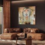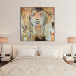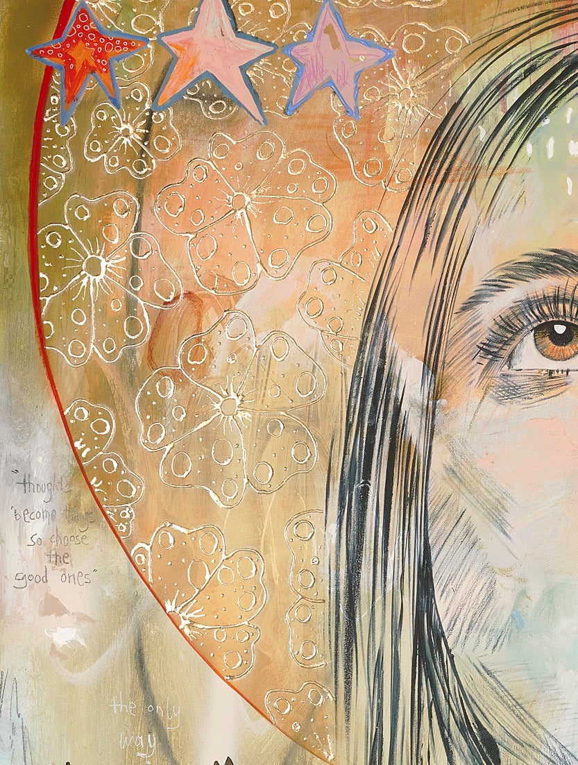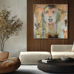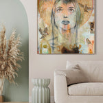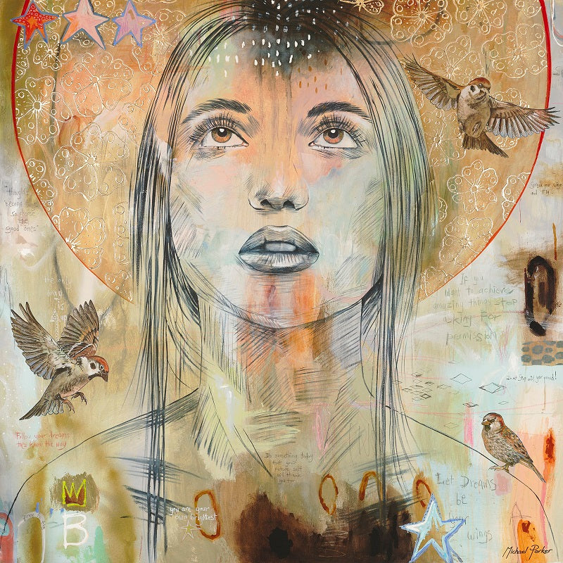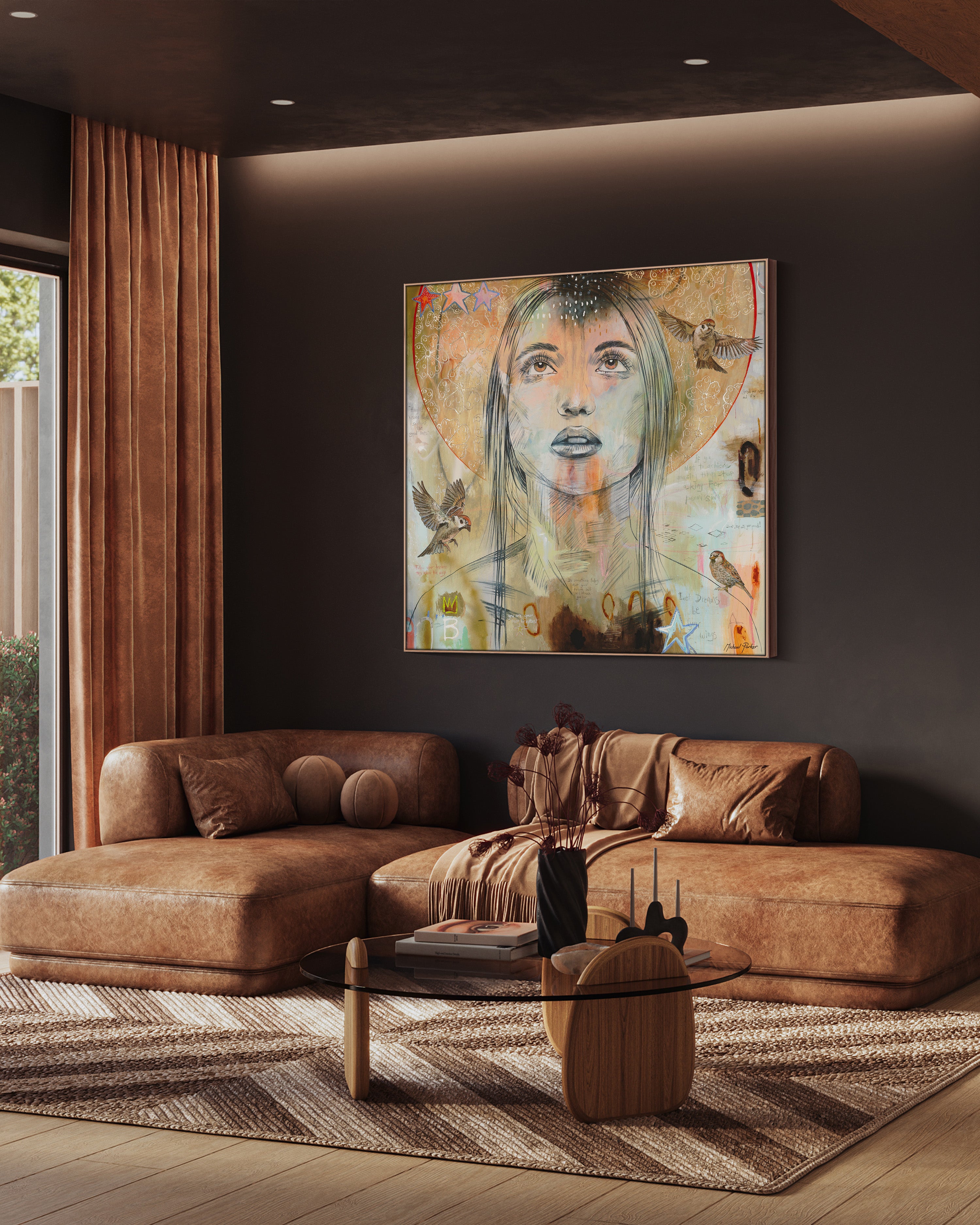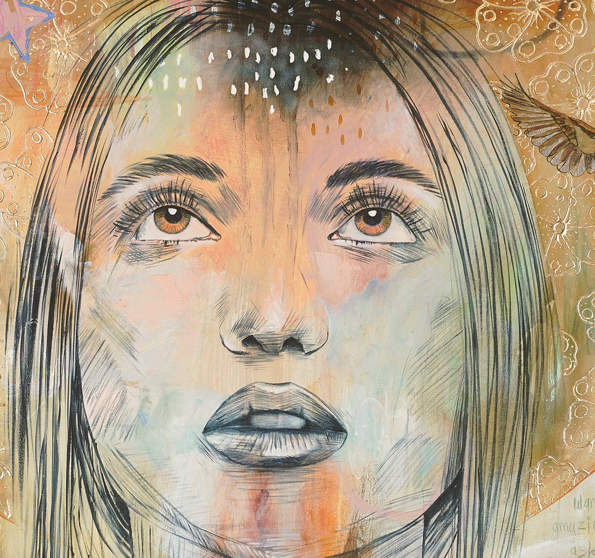 With Brave Wings She Flies is a celebration of inner courage and quiet awakening. The central figure gazes upward, illuminated by a symbolic golden halo that reflects her expanding consciousness and hope. Surrounding her, sparrows rise and circle, messengers of resilience, freedom, and gentle strength. Layers of marks, patterns, and handwritten affirmations weave through the composition, echoing the complexity of personal growth. Soft warm tones blend with cool hues to create a dreamlike, uplifting atmosphere. This piece invites viewers to look inward, trust their own path, and embrace the brave wings they already carry within.