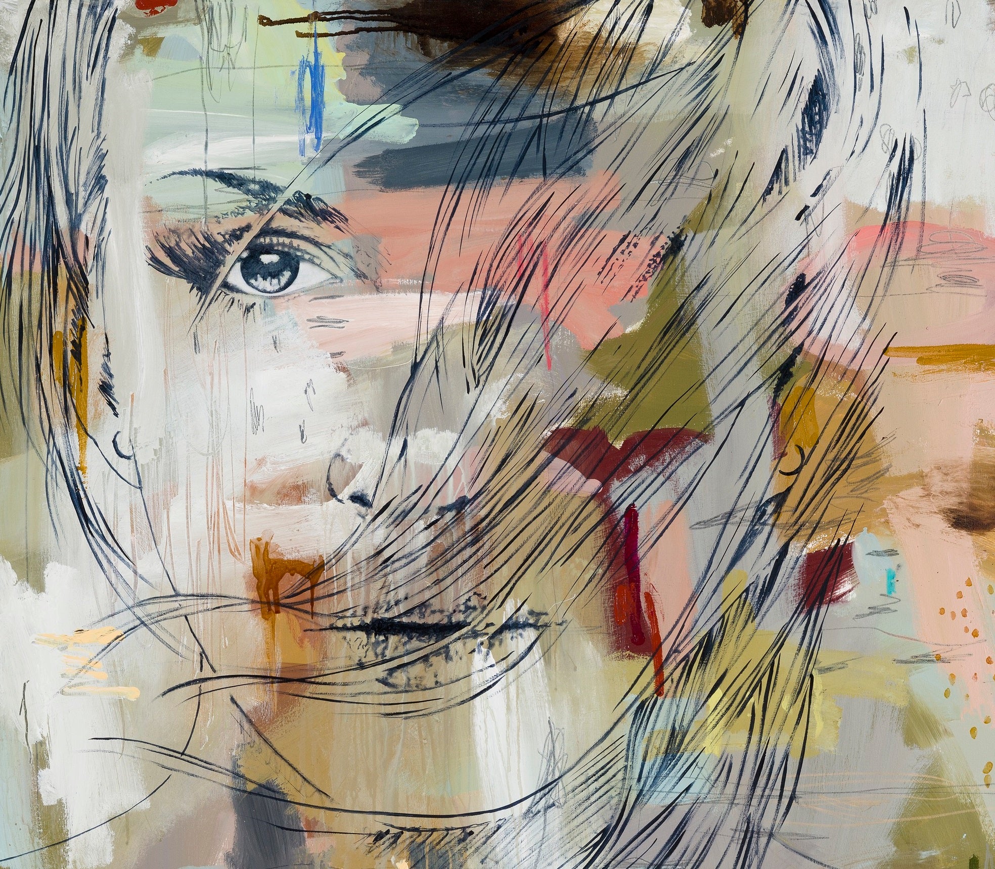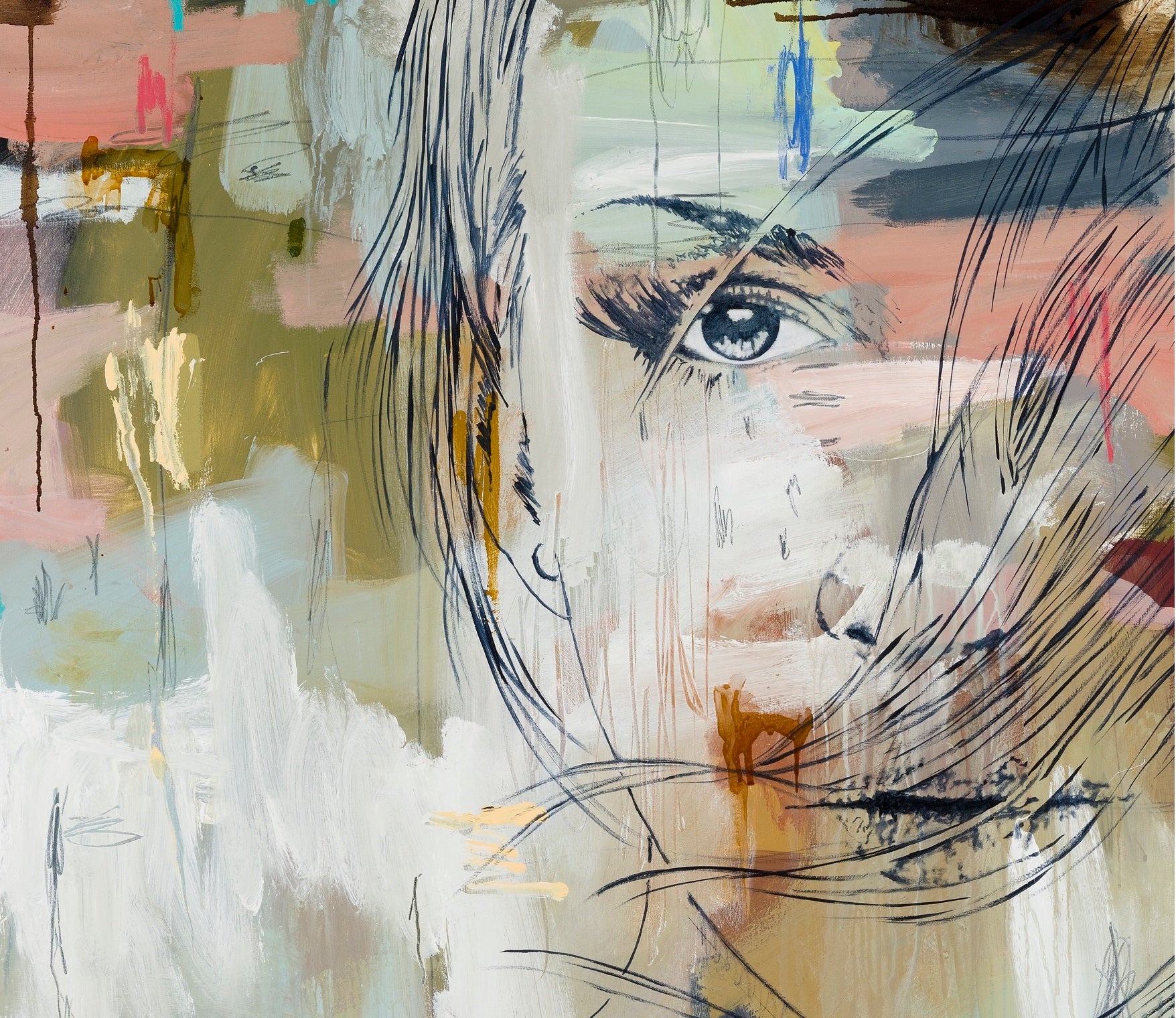 Against the Wind explores the quiet resilience of moving forward through unseen resistance. The portrait emerges delicately from a storm of colour and texture, her gaze steady, almost defiant, as fine lines trace windswept strands of hair across her face. Layers of brushwork and expressive marks swirl around her, capturing the turbulence of emotion and memory. She stands as a symbol of inner strength—weathered, yet unyielding. This piece speaks to those moments when we carry on despite the odds, guided by instinct and quiet resolve. It is about courage, vulnerability, and the beauty of holding one’s ground in motion.