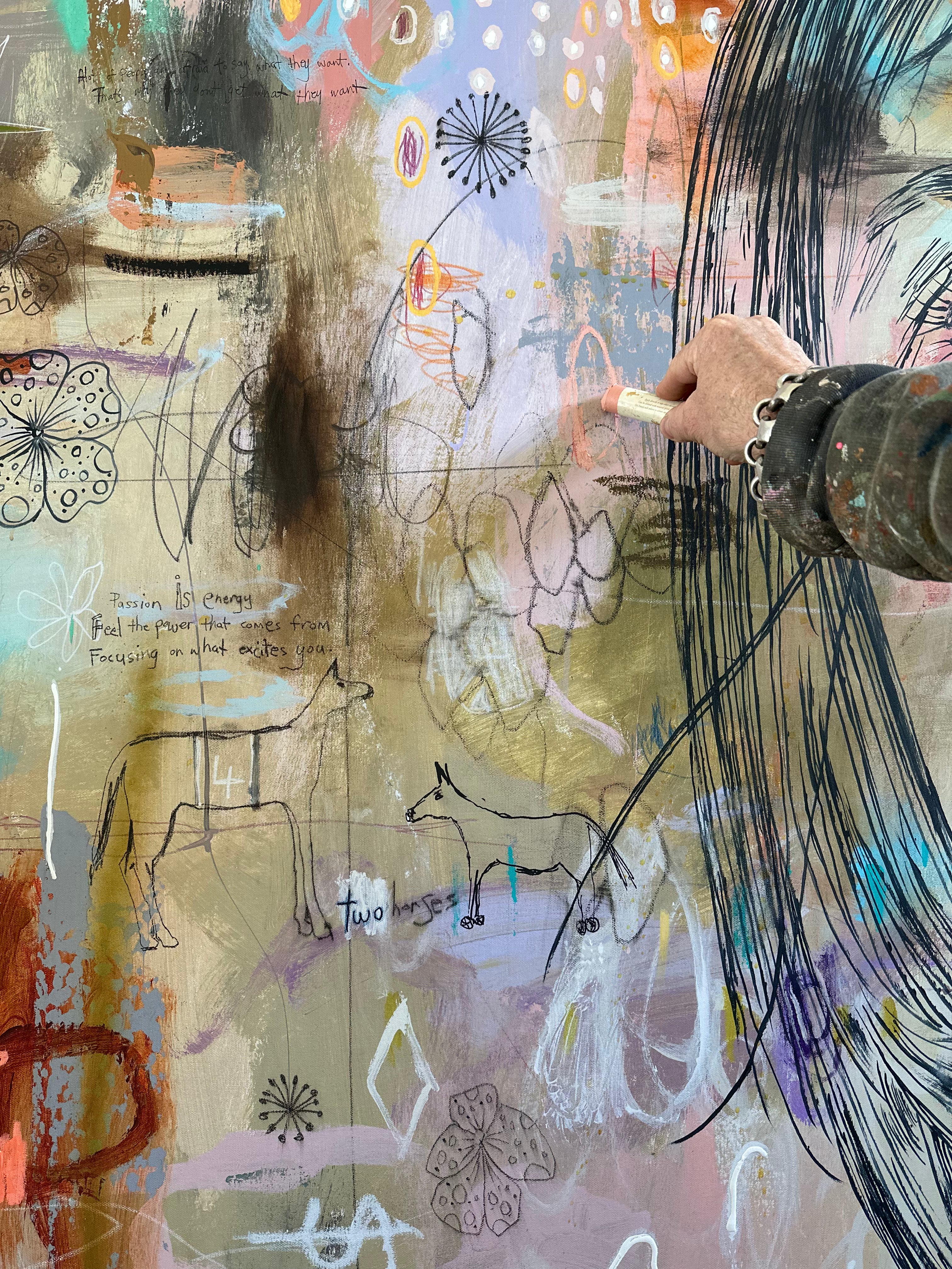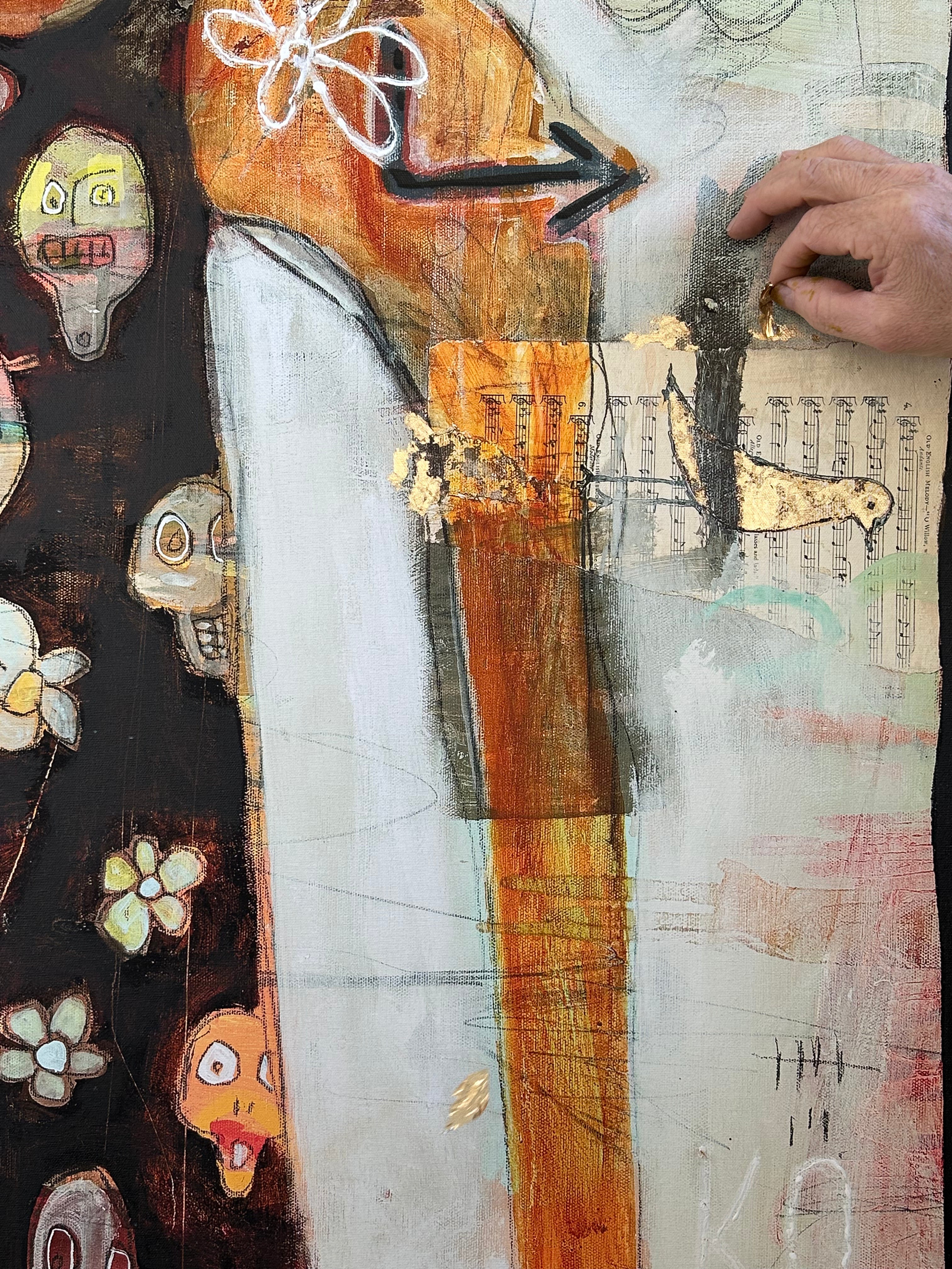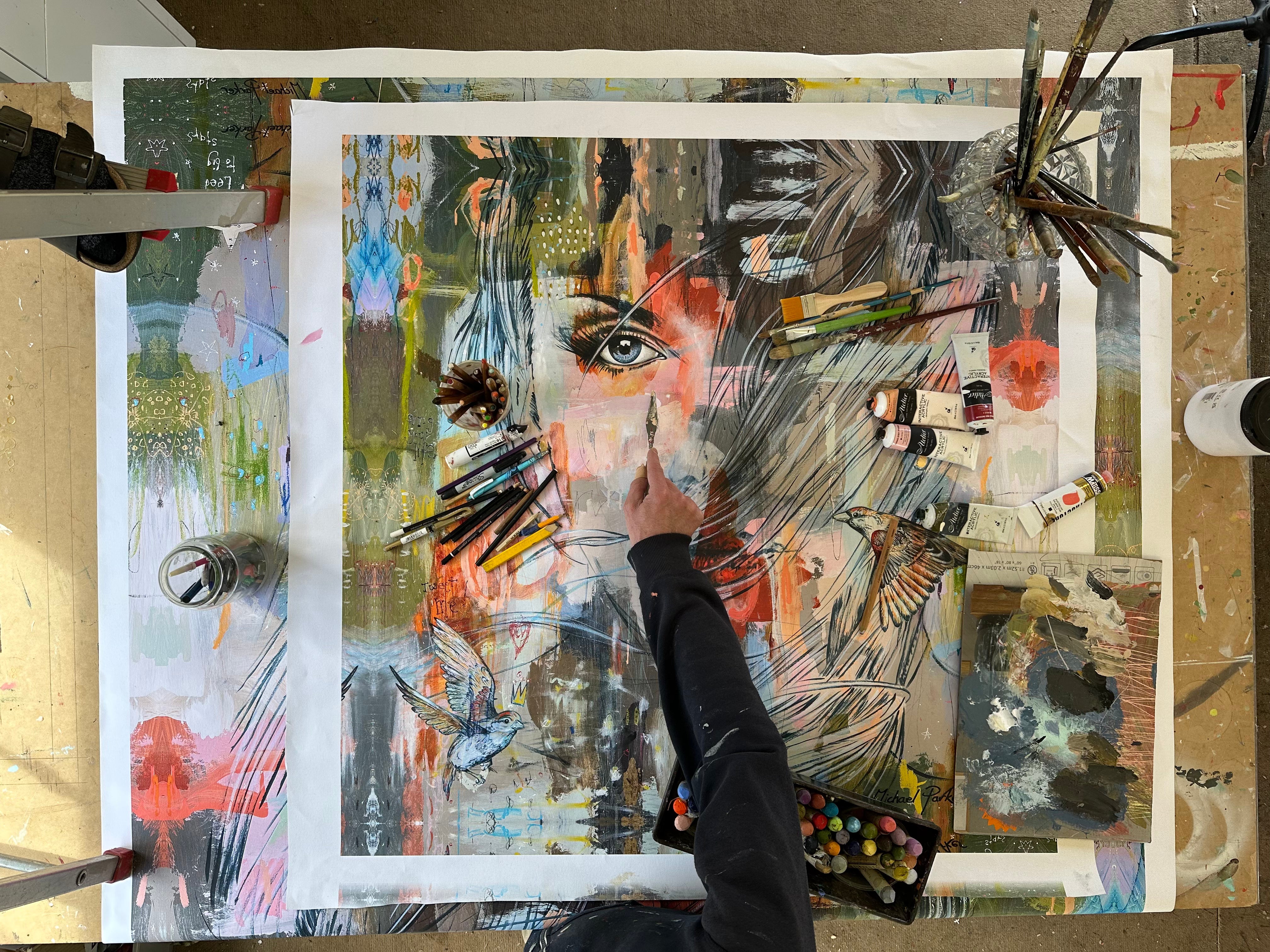 A hand-embellished print is a fine art reproduction that has been personally reworked by Michael Parker in the studio. Each piece may include brushstrokes, painted highlights, gold gilding, collage elements, resin, or added texture — all applied by hand. No two are ever the same.