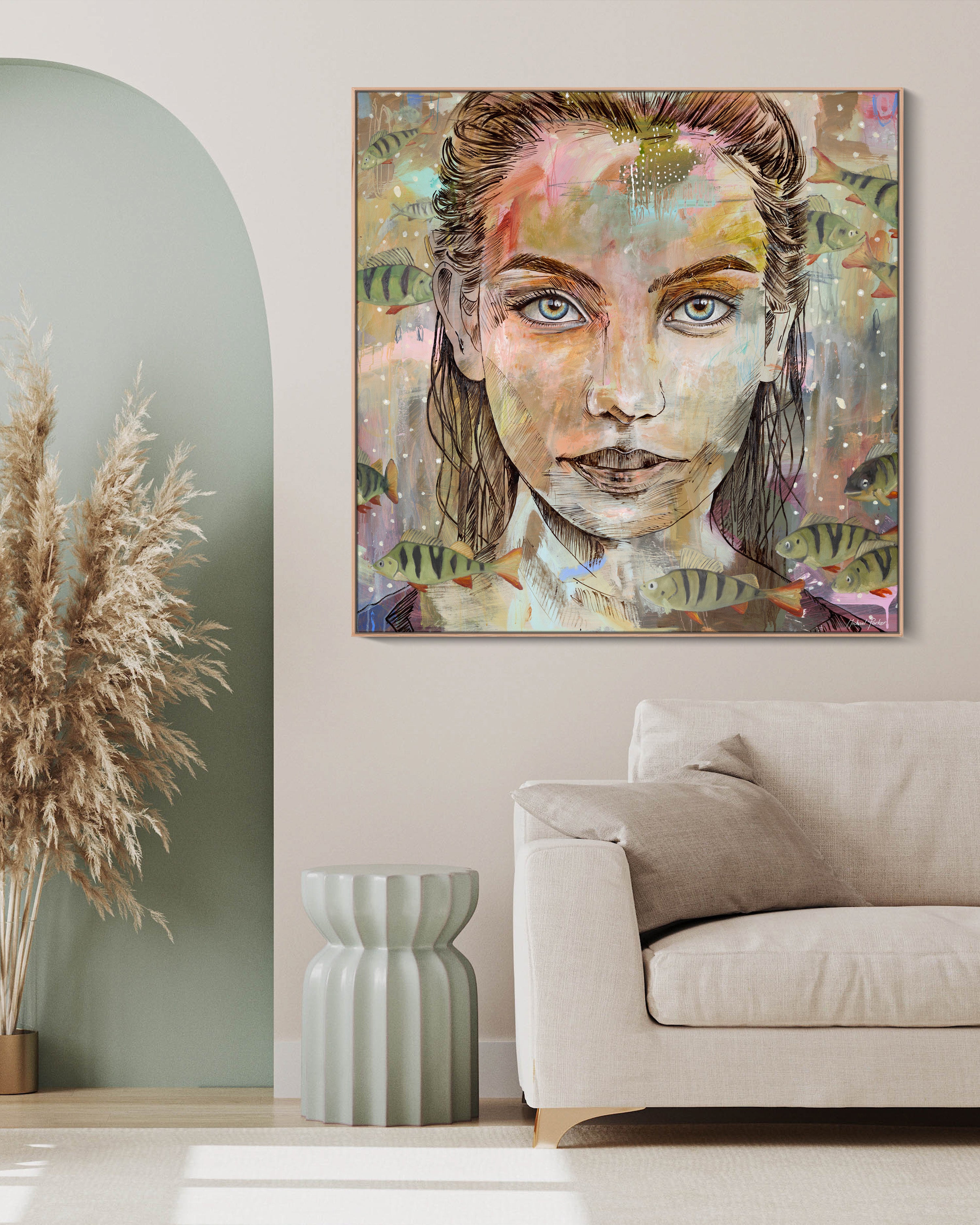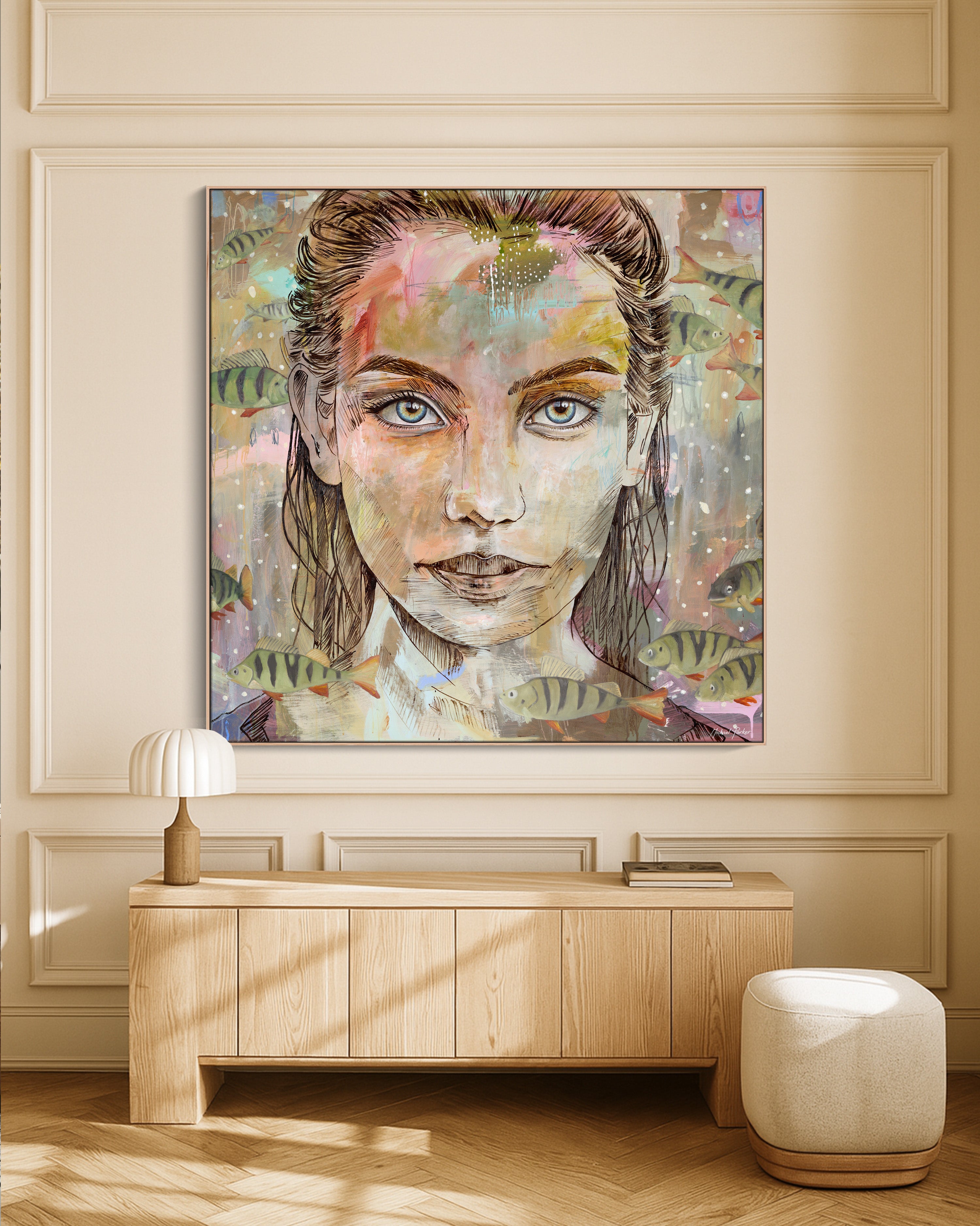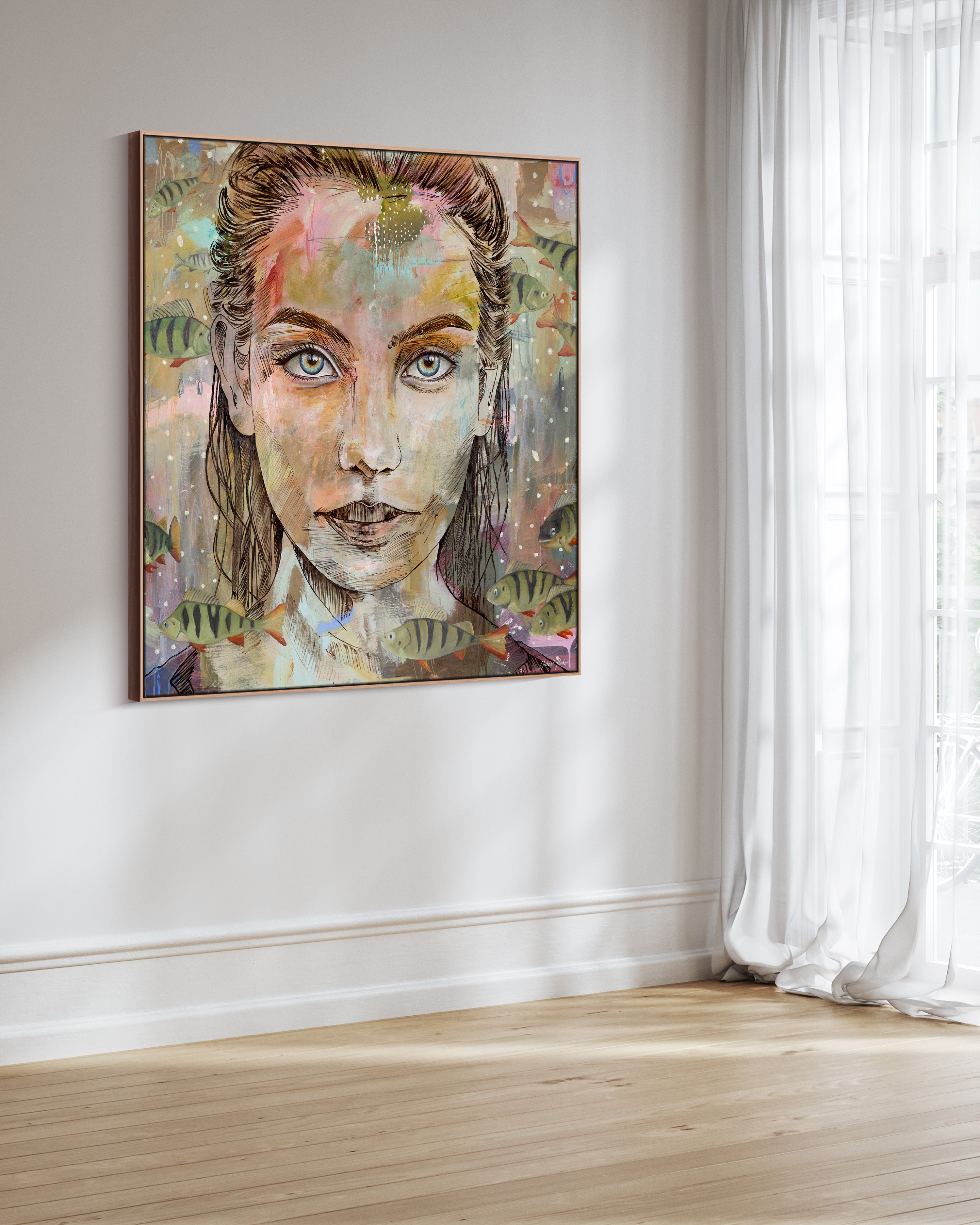A View From My Window is a portrait of quiet power and fierce self-possession. The figure’s steady gaze anchors the viewer, cool, composed, and unwavering as if she's both observing and challenging the world beyond the frame. Surrounded by rhythmic mark-making and floating fish, the scene pulses with a surreal stillness. It blurs the line between outer reality and inner vision, inviting us to pause and reflect on what we see and what we feel. This piece is a study in strength beneath serenity a reminder that clarity and courage often speak in stillness.
