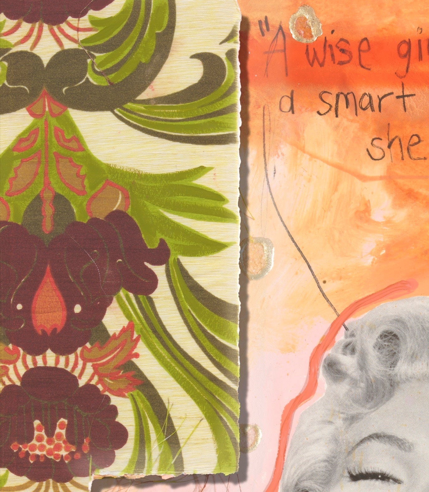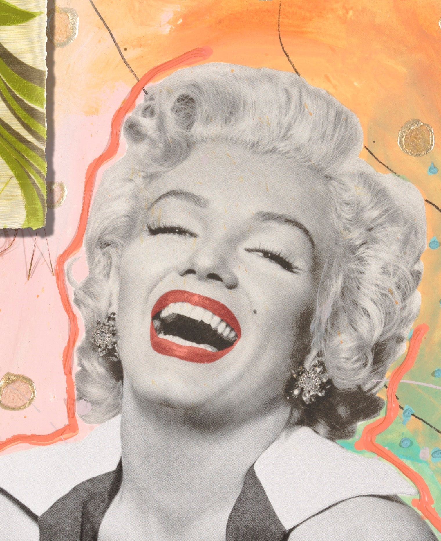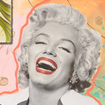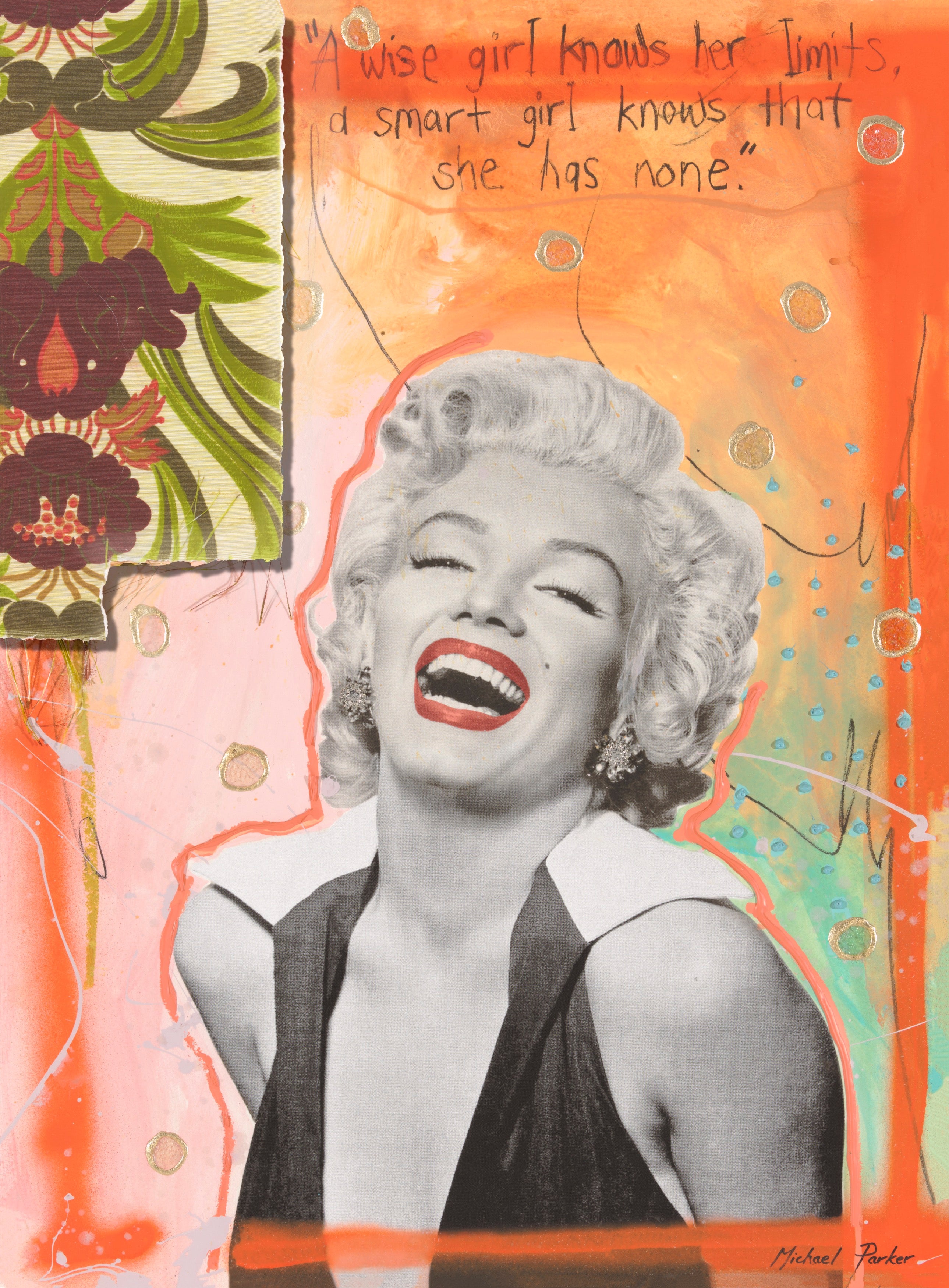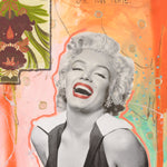 A Wise Girl Knows Her Limits, a Smart Girl Knows She Has None takes its name from Marilyn Monroe’s iconic quote, a declaration of confidence and self-determination. In this work, Monroe’s radiant laughter and striking presence become symbols of empowerment, transcending the vulnerability often attached to her image. The vibrant background of oranges, florals, and layered textures contrasts with the monochrome portrait, celebrating both her timeless glamour and her enduring spirit. The piece honours Monroe as more than a Hollywood icon: it frames her as a voice of resilience, intelligence, and limitless possibility, inviting reflection on strength behind beauty.