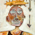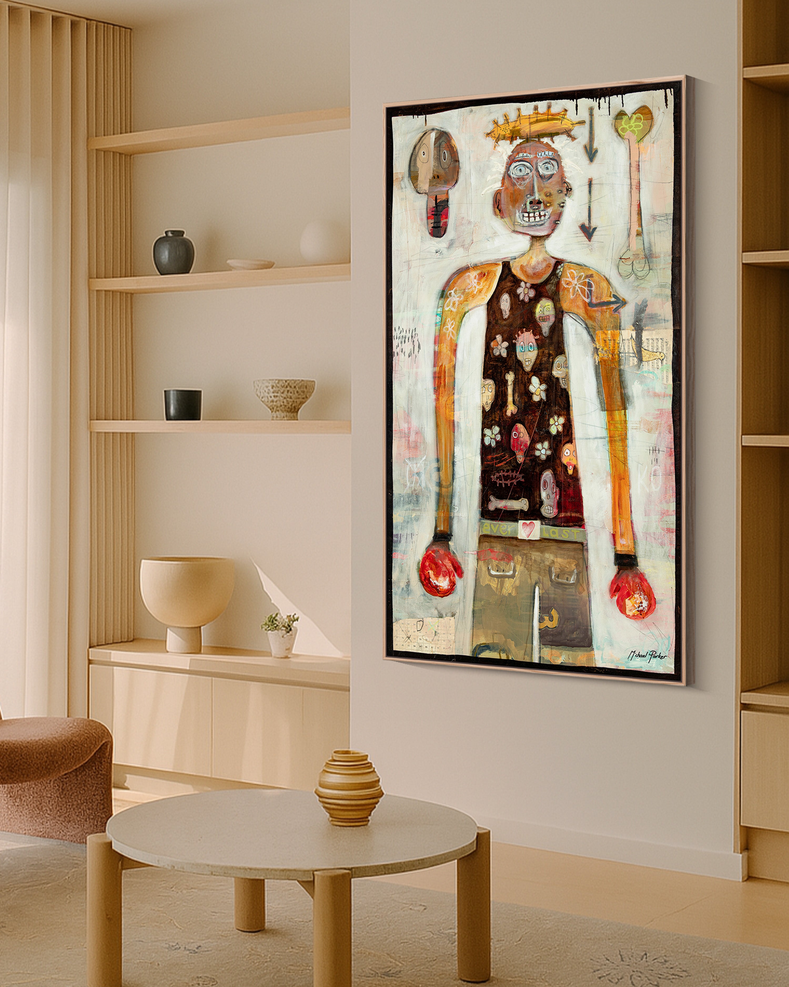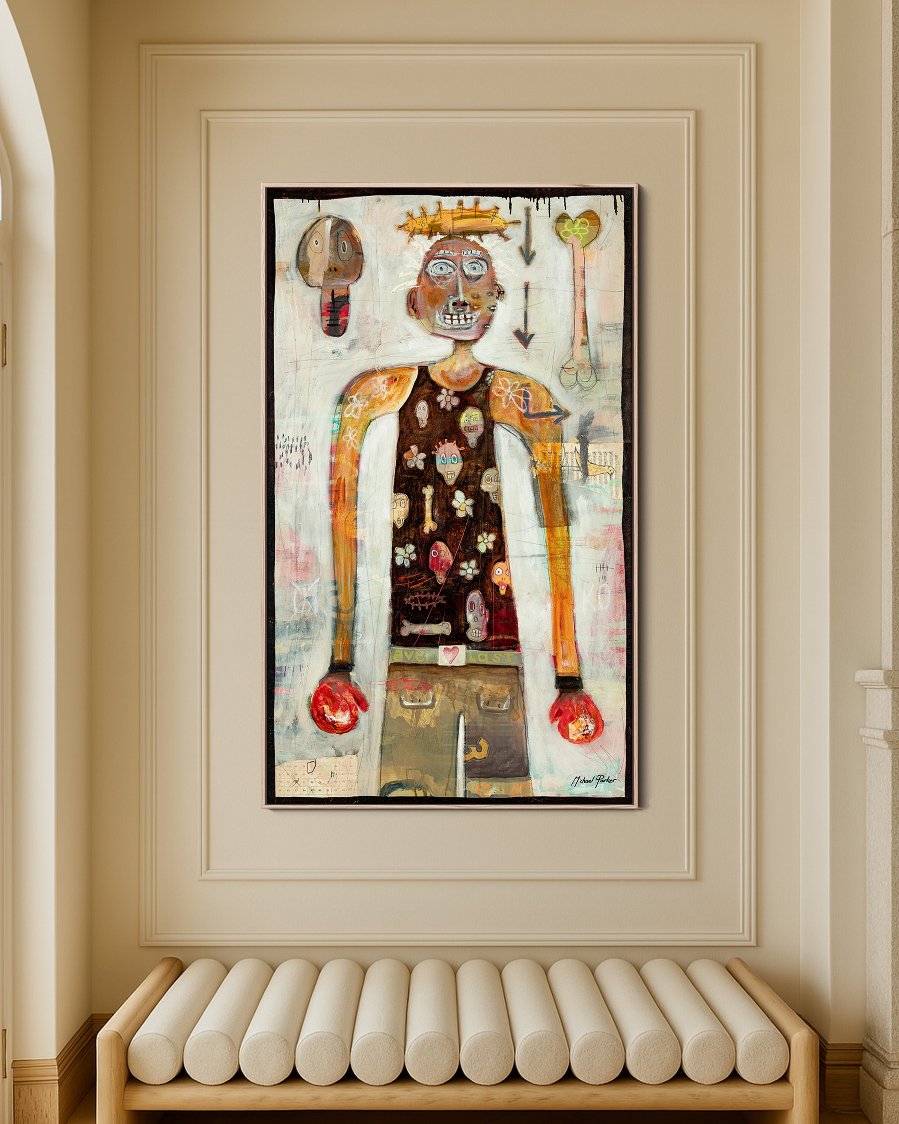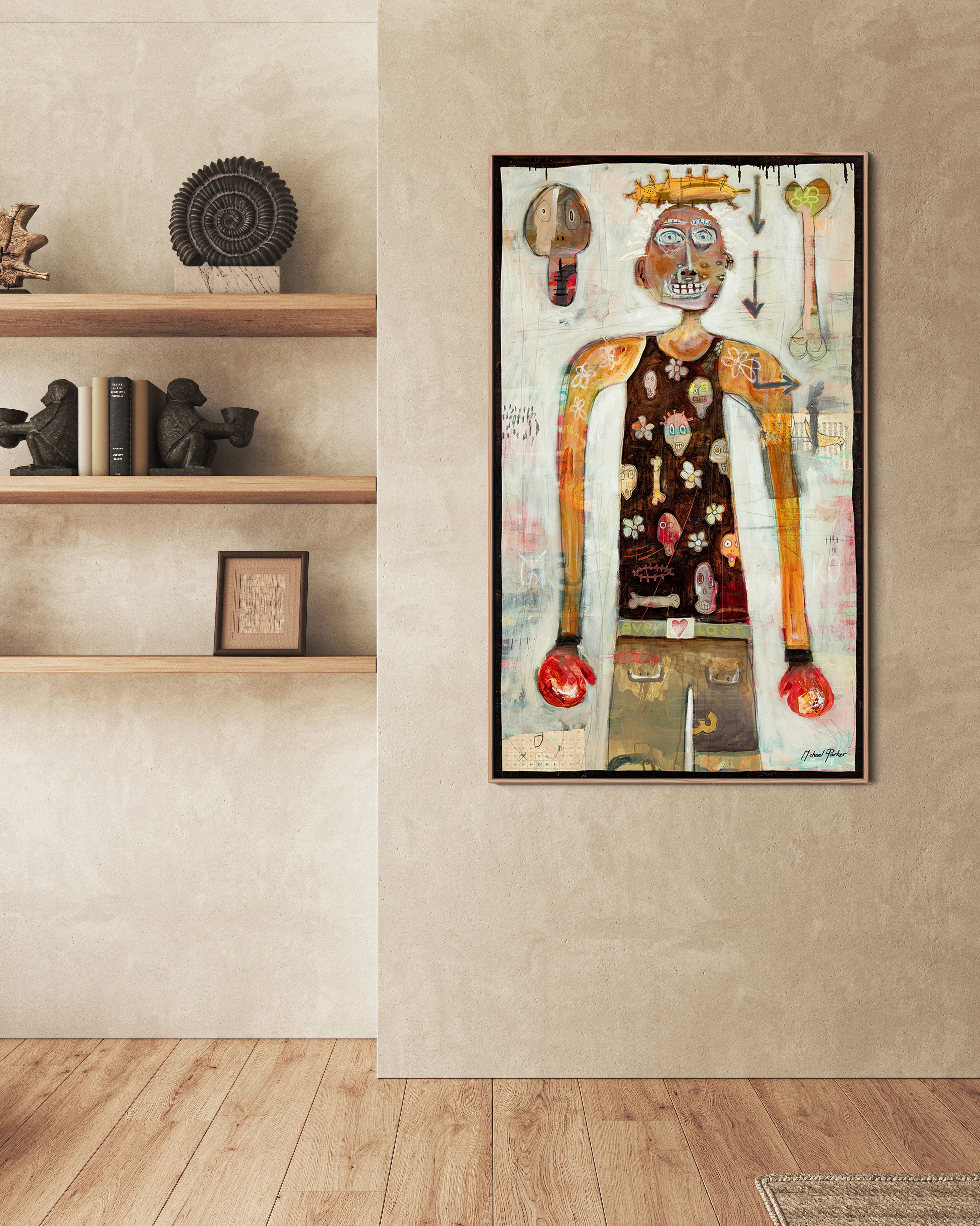Billy Joe Long Arms is a celebration of individuality, resilience, and the power of reaching beyond what seems possible. With exaggerated limbs and boxing gloves, Billy Joe stands tall and ready — part fighter, part folk hero. His patchwork tank is adorned with skulls, fish, bones, and flowers, each a symbol of the oddities and beauty of life. Arrows, bones, and cartoonish figures swirl around him, inviting viewers into a world where toughness and tenderness coexist. Painted with humour and grit, this piece champions the underdog — the misfit who wears his heart on his sleeve and keeps swinging no matter what.