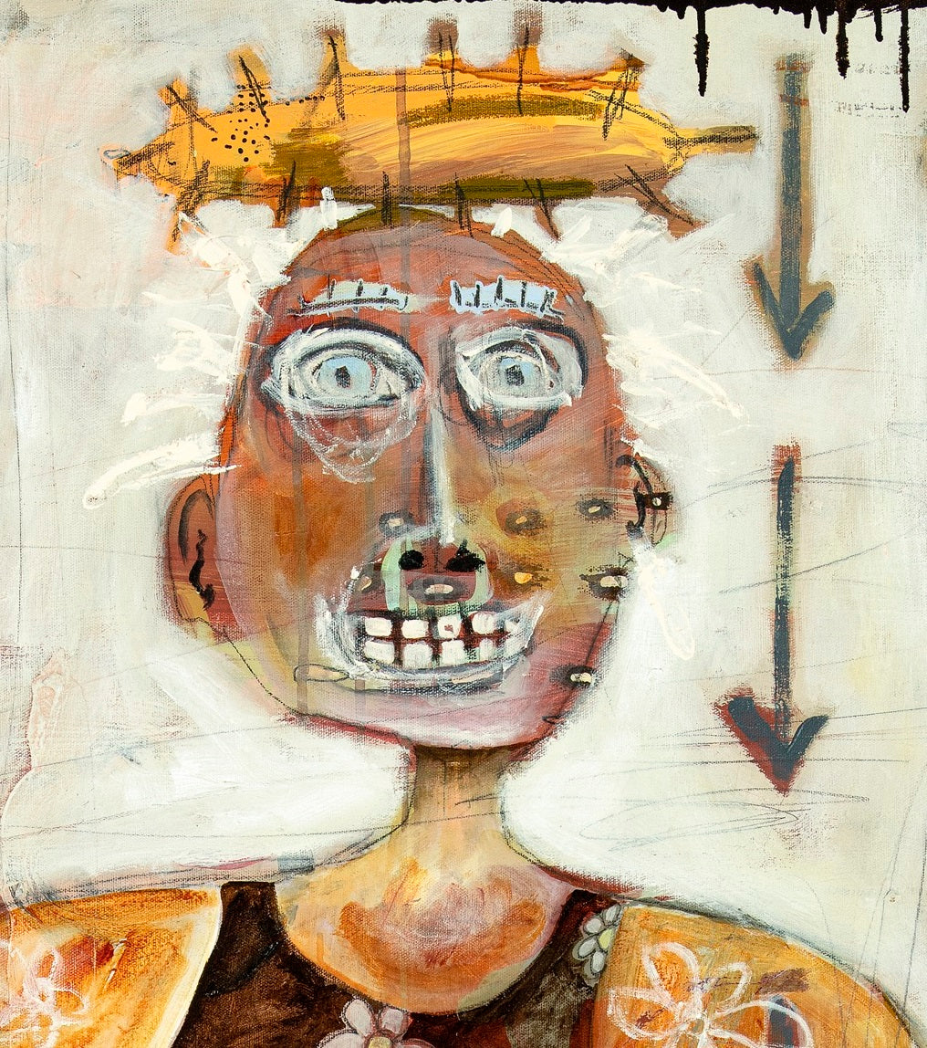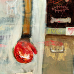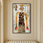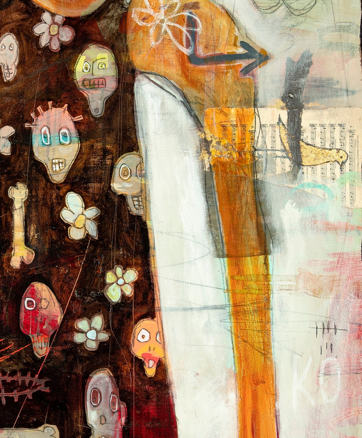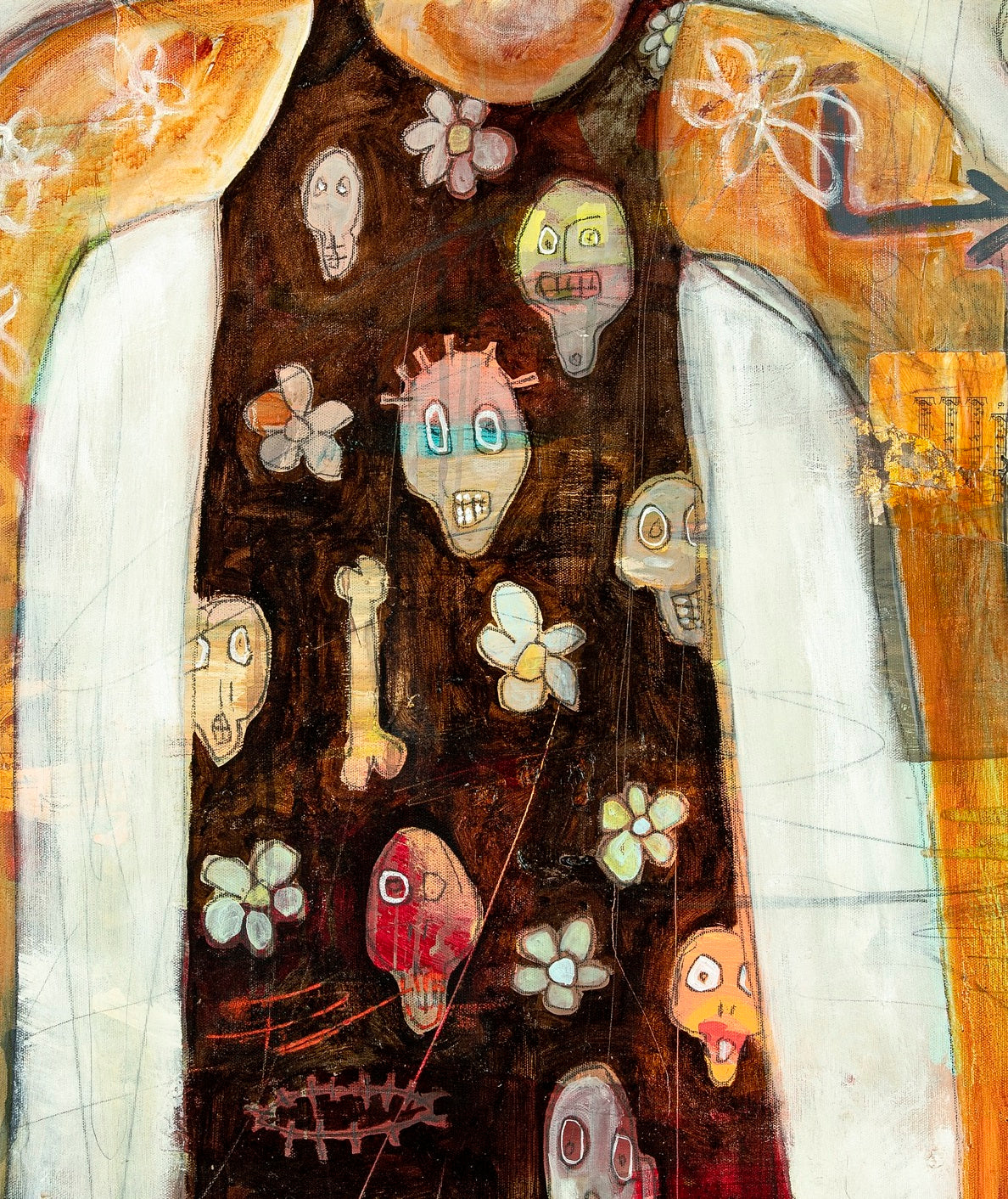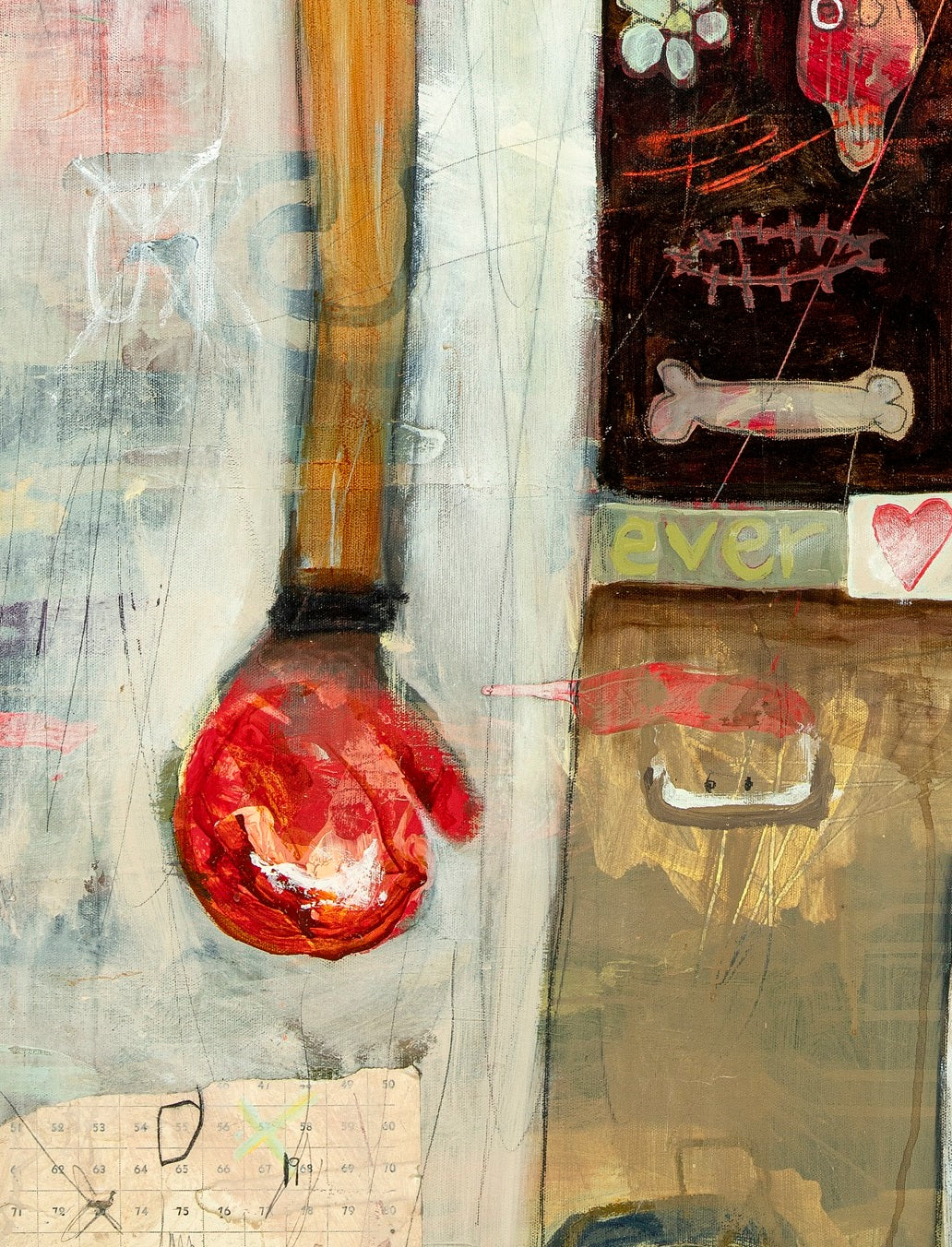Billy Joe Long Arms is a celebration of individuality, resilience, and the power of reaching beyond what seems possible. With exaggerated limbs and boxing gloves, Billy Joe stands tall and ready — part fighter, part folk hero. His patchwork tank is adorned with skulls, fish, bones, and flowers, each a symbol of the oddities and beauty of life. Arrows, bones, and cartoonish figures swirl around him, inviting viewers into a world where toughness and tenderness coexist. Painted with humour and grit, this piece champions the underdog — the misfit who wears his heart on his sleeve and keeps swinging no matter what.