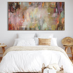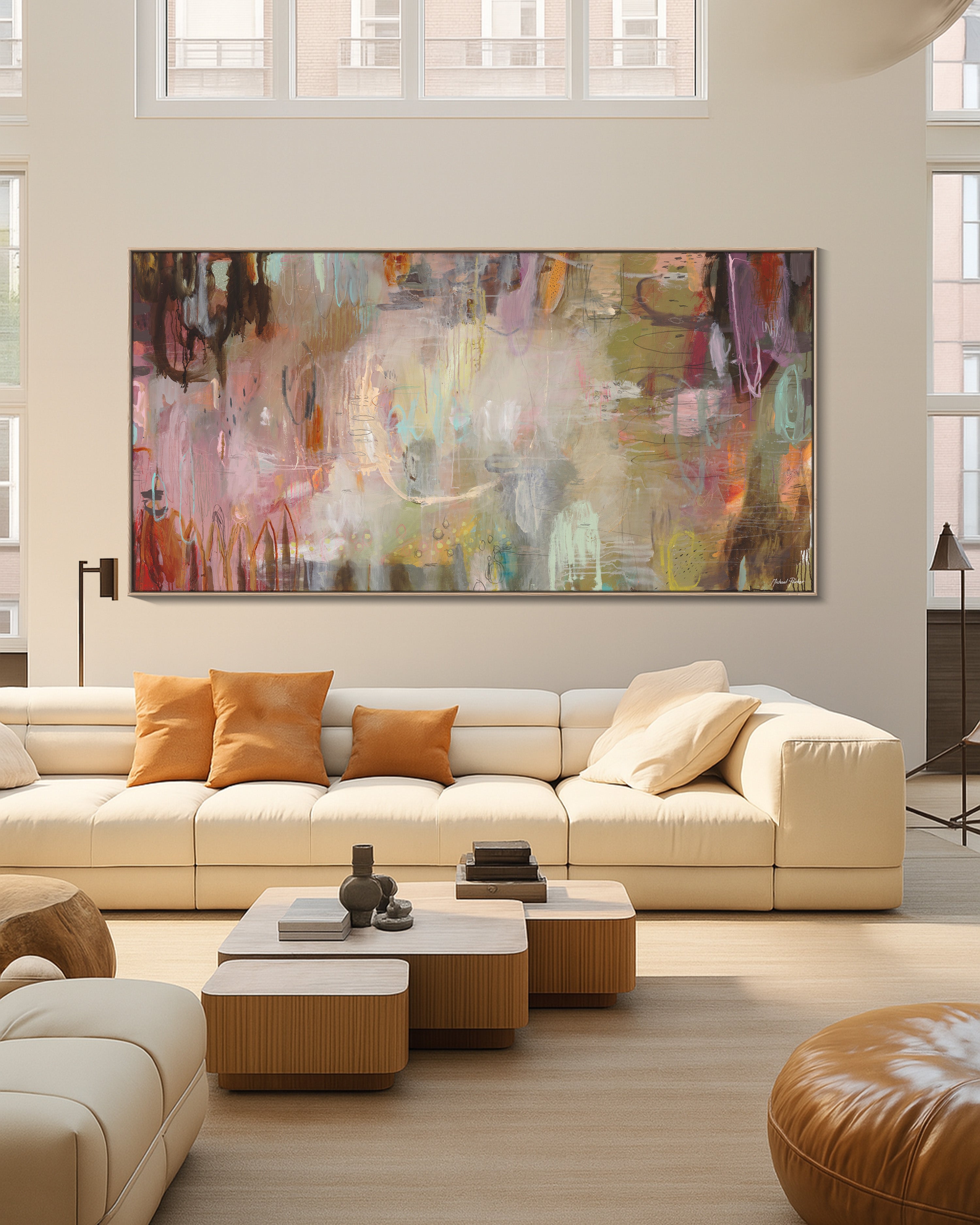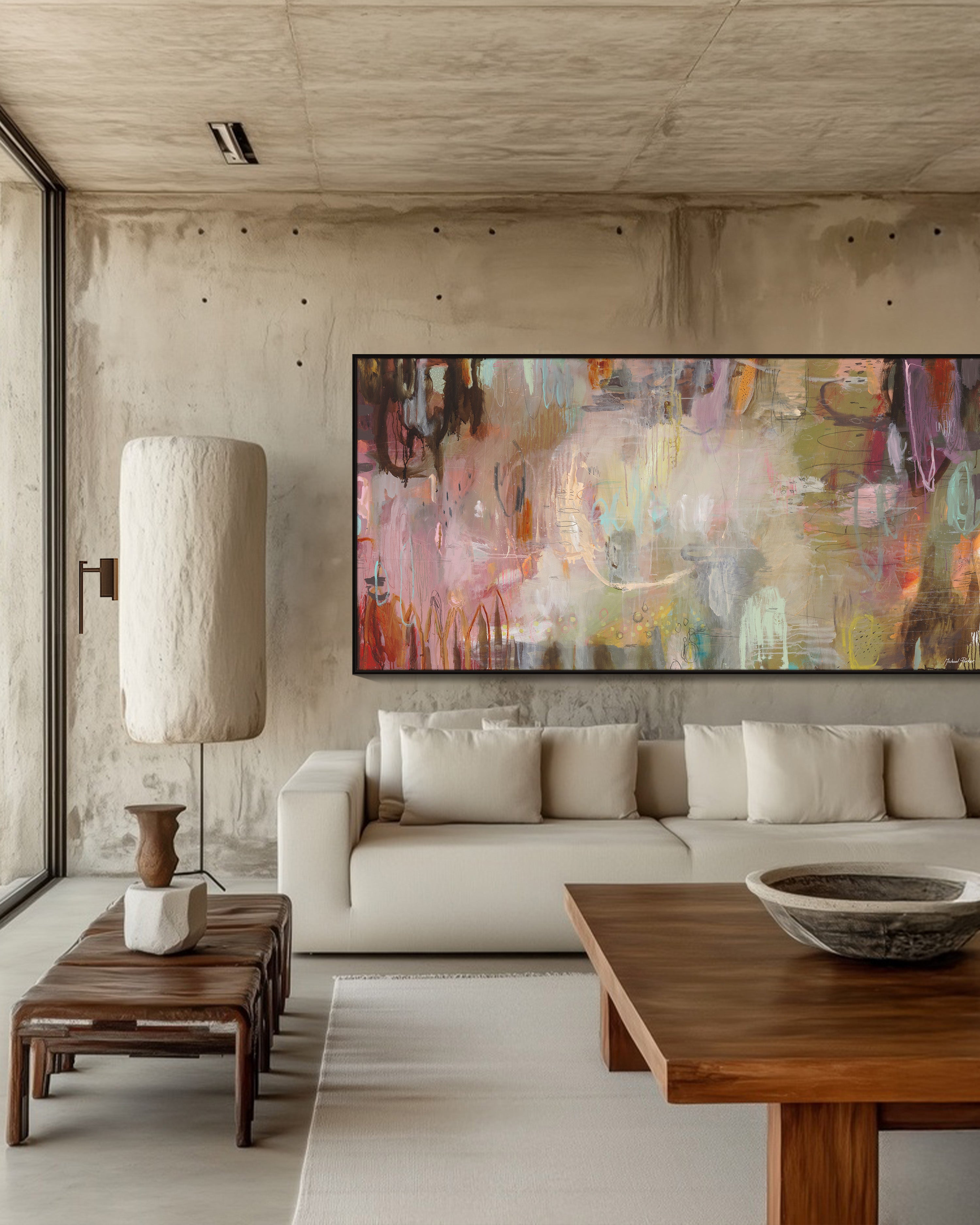Stretched canvases are mounted over high-quality timber stretcher bars and arrive with hanging wire pre-installed — simply unbox and hang.
